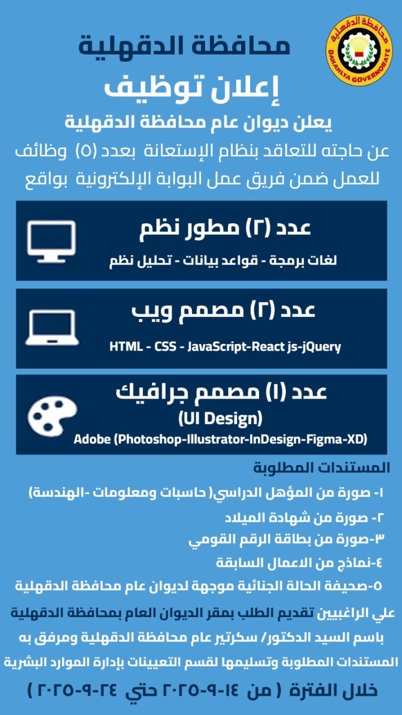 بشرى سارة .. محافظة الدقهلية تعلن عن فرص عمل.. تعرف علي التخصصات المطلوبة وموعد وطريقة التقديم