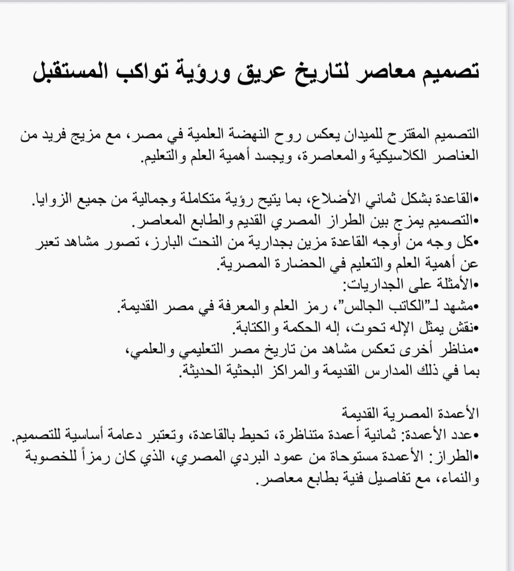 فكرة تصميم الميدان : تتخذ القاعدة شكلًا ثُمانيَّ الأضلاع بما يتيح رؤية متكاملة وجمالية من جميع الاتجاهات ، تتزين واجهات القاعدة بـنحت بارز يستحضر مشاهد من الحضارة المصرية ودور التعليم عبر العصور، ومن بينها مشهد (الكاتب الجالس ) بوصفه رمزًا للحكمة والمعرفة والكتابة ، يحيط بالقاعدة طوق من أعمدة مصرية الطابع (مستوحاة من عمود البَرْدي المصري رمز الخصوبة والنماء) بتفاصيل فنية حديثة تعزّز حضور الهوية المحلية في إطار معاصر.