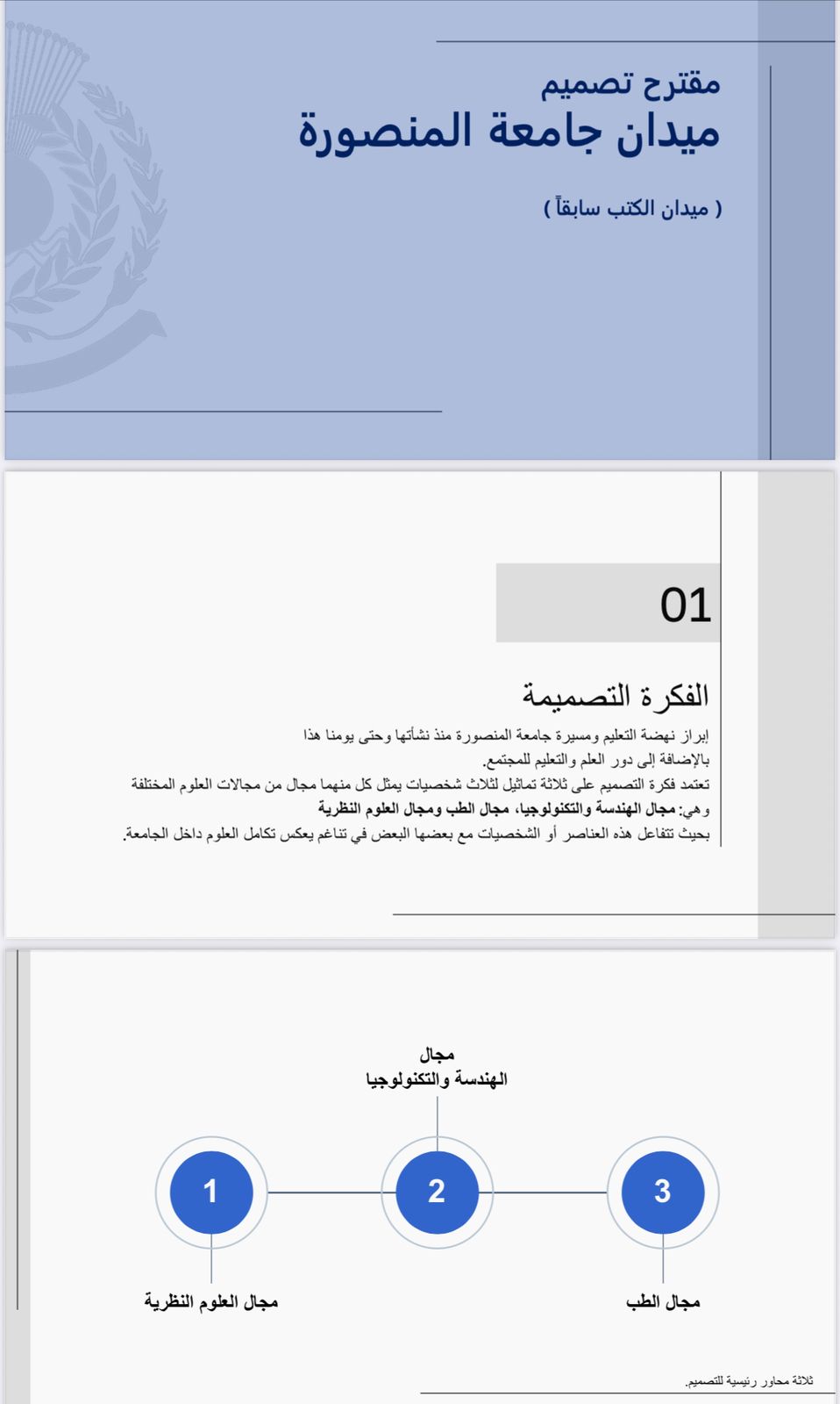 يعتمد المشروع على رؤية معمارية تُبرز مسيرة جامعة المنصورة ودور العلم في خدمة المجتمع، من خلال ثلاثة محاور معرفية تمثل ( الطب، والهندسة والتكنولوجيا، والعلوم النظرية ) في تكامل يرمز لتضافر التخصصات داخل الجامعة.