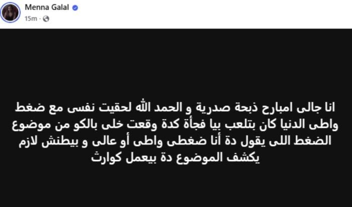 وكتبت منة جلال، عبر حسابها الرسمي بموقع التواصل الاجتماعي «فيسبوك»: «أنا جالى امبارح ذبحة صدرية، والحمد الله لحقيت نفسى مع ضغط واطى، الدنيا كان بتلعب بيا فجأة كدة وقعت، خلى بالكو من موضوع الضغط اللى يقول دة أنا ضغطى واطى أو عالى و بيطنش، لازم يكشف الموضوع دة بيعمل كوارث»