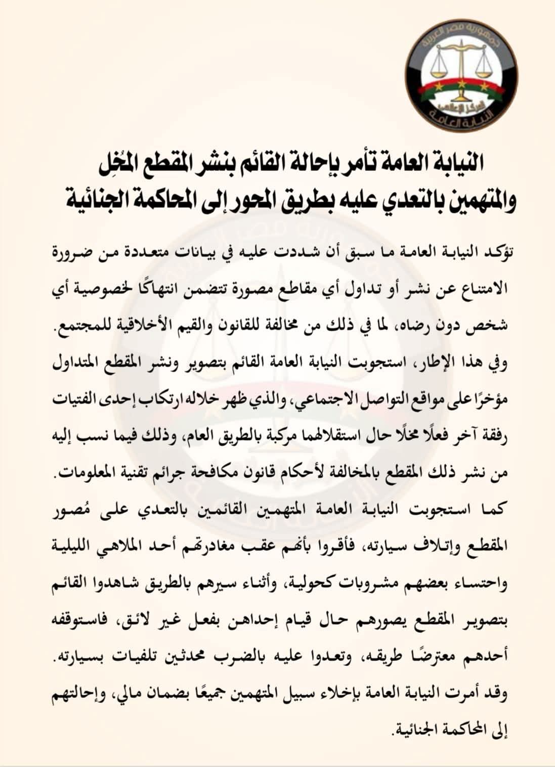 النيابة العامة تأمر بإحالة القائم بنشر المقطع المُخِل والمتهمين بالتعدي عليه بطريق المحور إلى المحاكمة الجنائية