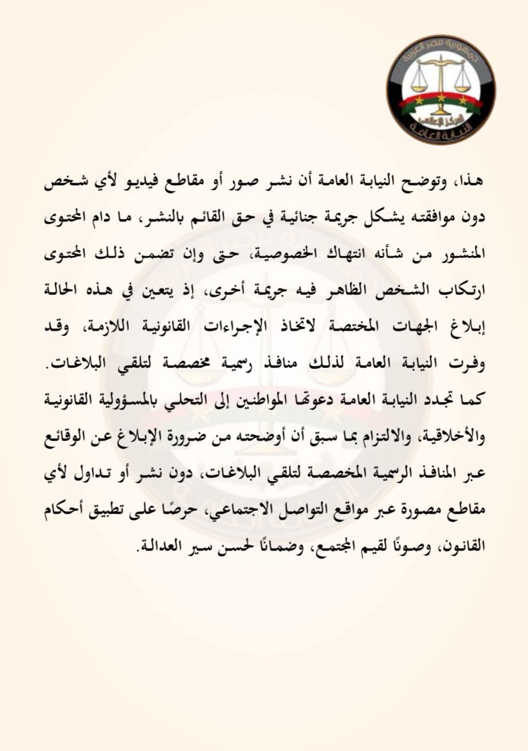 هذا، وتوضح النيابة العامة أن نشر صور أو مقاطع فيديو لأي شخص