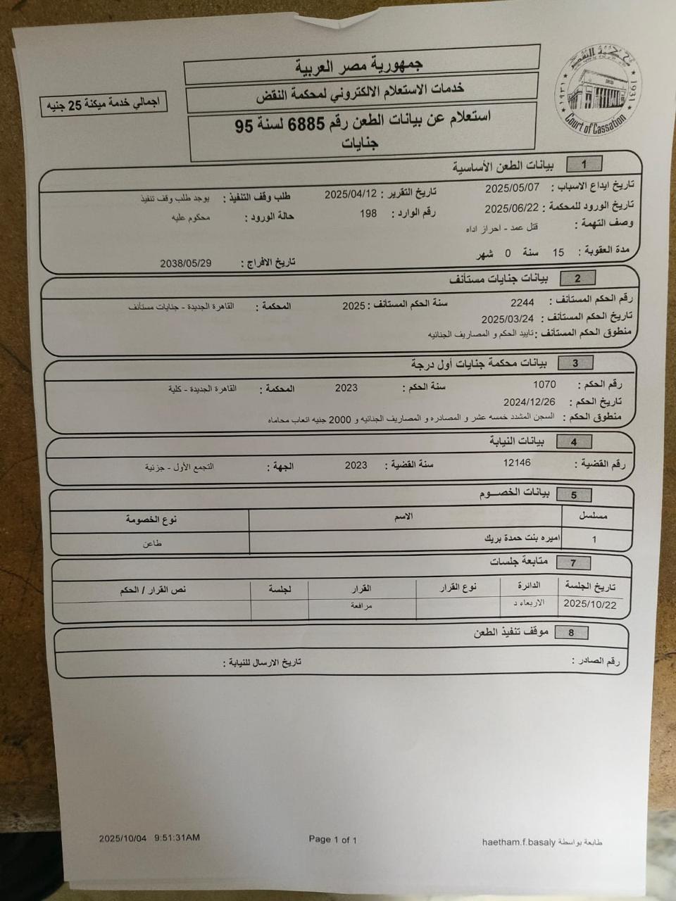 أكد المحامى احمد حمد محكمه النقض تحدد ٢٢/ ١٠ آخر جلسات المضيفه التونسيه قاتلة ابنتها بالرحاب حيث حددت محكمة النقض، اليوم الجمعة، جلسة 22 أكتوبر الجاري لنظر الطعن المقدم من مضيفة الطيران التونسية «أميرة بنت حمد» على الحكم الصادر ضدها بالسجن المشدد لمدة 15 عامًا، بعد إدانتها بقتل ابنتها داخل شقتها بمدينة الرحاب في القاهرة