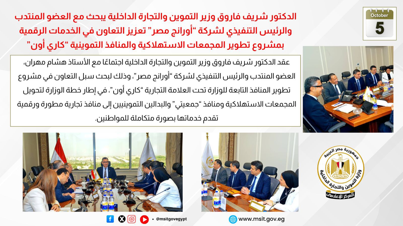 كما بحث الدكتور شريف فاروق مع العضو المنتدب والرئيس التنفيذي لشركة “أورانج مصر” فرص التعاون في مجال الخدمات الرقمية لتطوير المجمعات الاستهلاكية والمنافذ التموينية، استكمالًا لجهود الوزارة في دمج التكنولوجيا الحديثة داخل منظومة السلع التموينية لضمان تجربة أفضل للمواطنين.