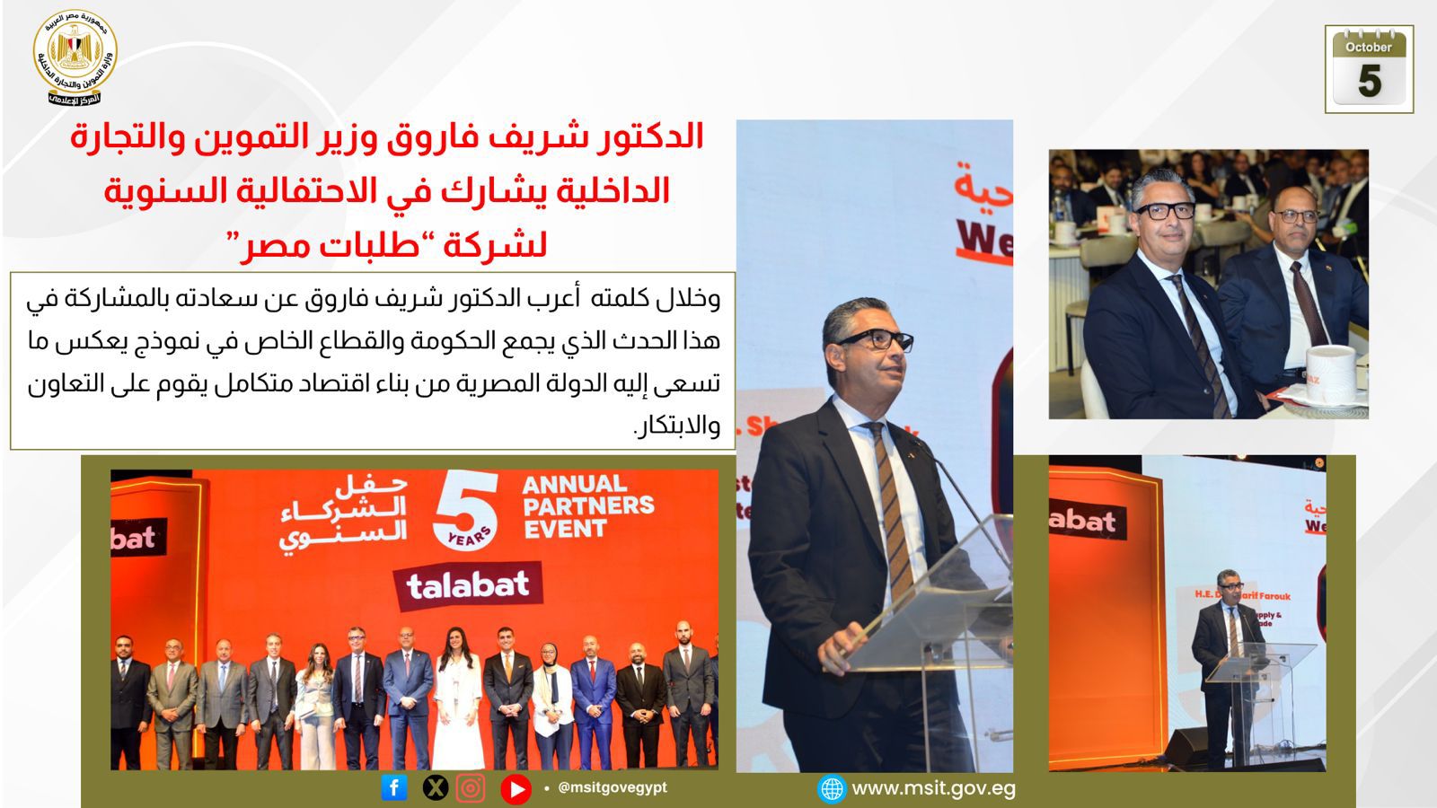 شارك وزير التموين والتجارة الداخلية في الاحتفالية السنوية لشركة “طلبات مصر”، بحضور قيادات الشركة وعدد من الشخصيات العامة، مؤكدًا أهمية الشراكة بين الدولة والقطاع الخاص في دعم منظومة الخدمات اللوجستية والغذائية وتعزيز الاقتصاد الوطني.
