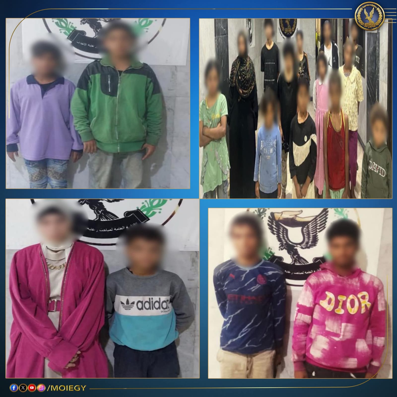 إستمراراً لجهود مكافحة جرائم إستغلال الأحداث .. فقد تمكنت الإدارة العامة لمباحث رعاية الأحداث بقطاع الشرطة المتخصصة من ضبط 11 رجل و10 سيدات- لـ 15 منهم معلومات جنائية لقيامهم بإستغلال الأطفال الأحداث فى أعمال التسول وإستجداء المارة وبيع السلع بطريقة إلحاحية بدوائر أقسام شرطة مدينة نصر أول ومدينة نصر ثان مدينة نصر ثالث - النزهة وبصحبتهم 26 حدث من المعرضين للخطر حال قيامهم ببيع السلع بشكل إلحاحى والتسول ، وبمواجهتهم إعترفوا بنشاطهم الإجرامى.