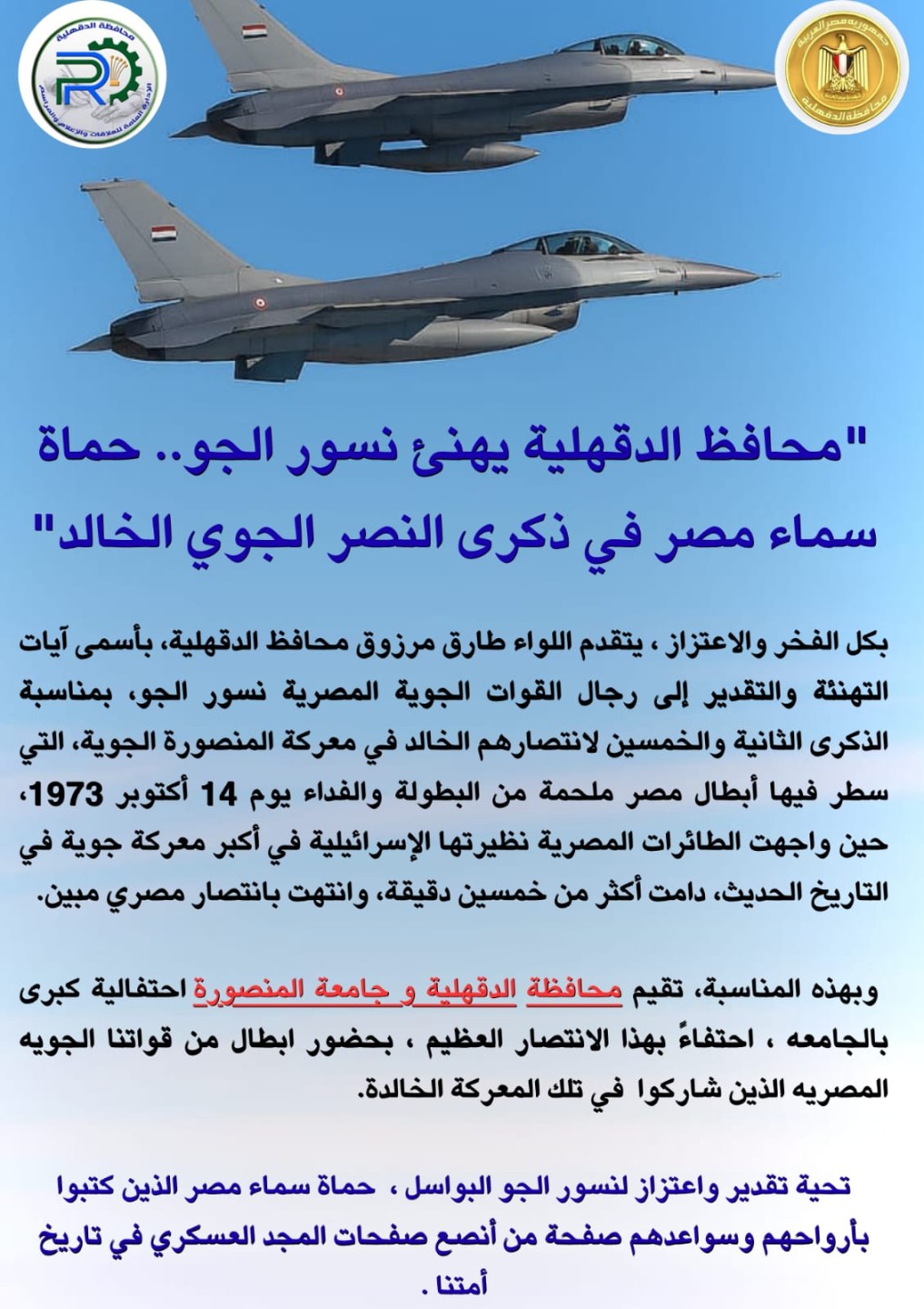 تقدم اللواء طارق مرزوق محافظ الدقهلية بالتهنئة القلبية لنسور الجو بمناسبة ذكرى معركة المنصورة البطولية عام 1973 التى سطروا خلالها ملحمة بطولية خالدة