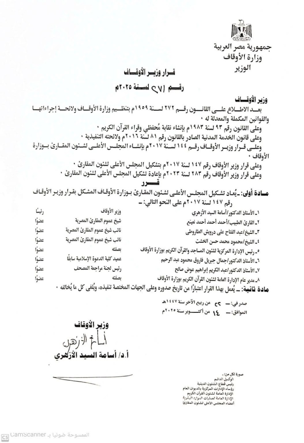 أصدر الدكتور أسامة الأزهرى ،وزير الأوقاف ، قرار بإعادة تشكيل المجلس الأعلى لشئون المقارئ بوزارة الأوقاف، وجاء التشكيل كالآتى: وزير الأوقاف رئيسا، القارئ الطبيب أحمد نعينع، شيخ عموم المقارئ المصرية، وكلا من الشيخ عبد الفتاح الطاروطى والشيخ محمود الخشت، نوابا ، ورئيس الادارة المركزية لشئون القرآن بصفته، والدكتور جمال فاروق عميد الدعوة الاسلامية السابق عضوا، والدكتور عبد الكريم صالح، رئيس لجنة المصحف عضوا، ومدير عام شئون القران بالوزارة بصفته.