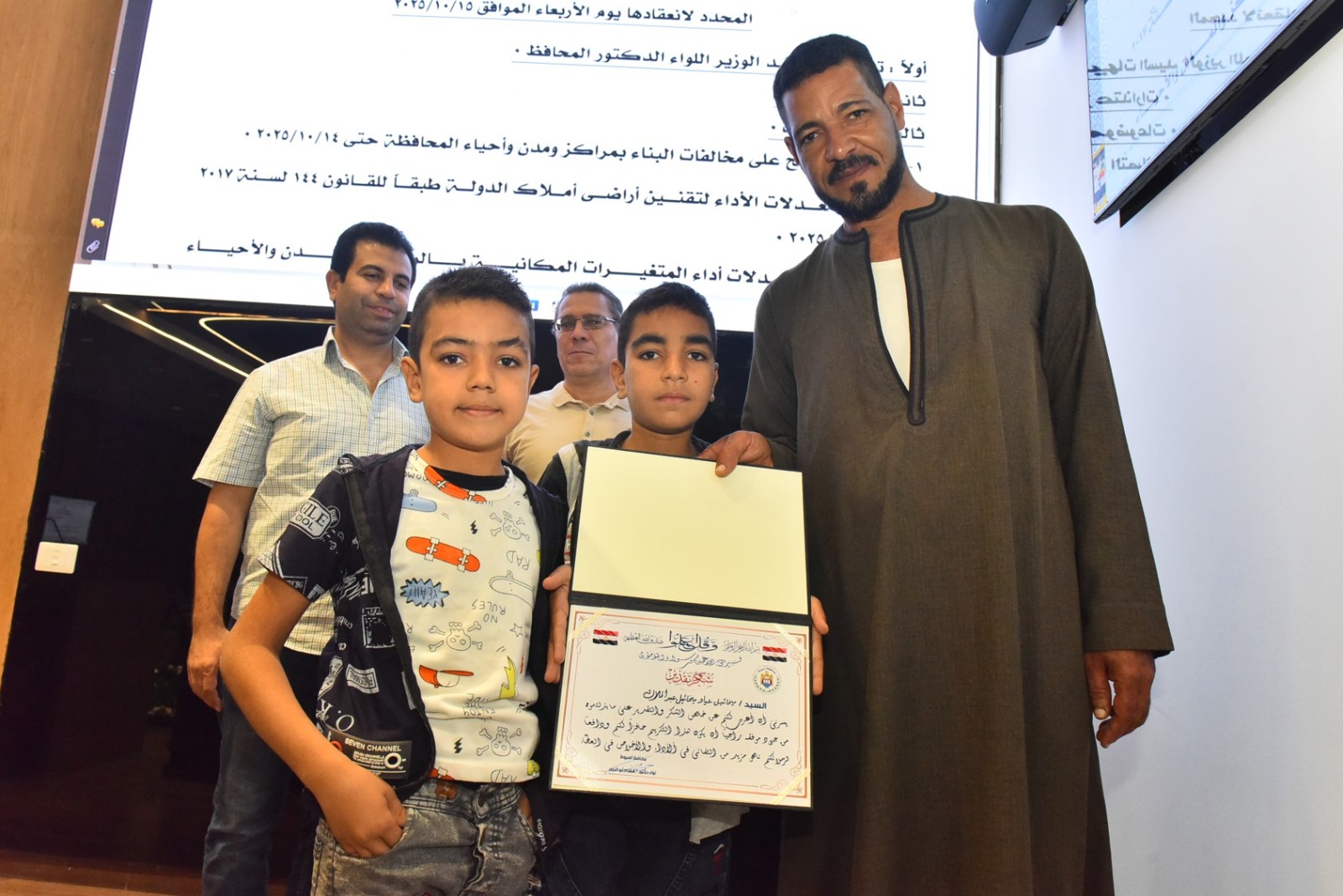 من جانبه، أعرب المواطن ميخائيل عياد عن امتنانه لتكريم المحافظ، مؤكداً أن ما قام به واجب إنساني لا ينتظر عليه جزاءً ولا شكوراً، وحرص على التقاط صورة تذكارية مع المحافظ بصحبة أبنائه، تعبيراً عن سعادته بهذه اللفتة الكريمة.
