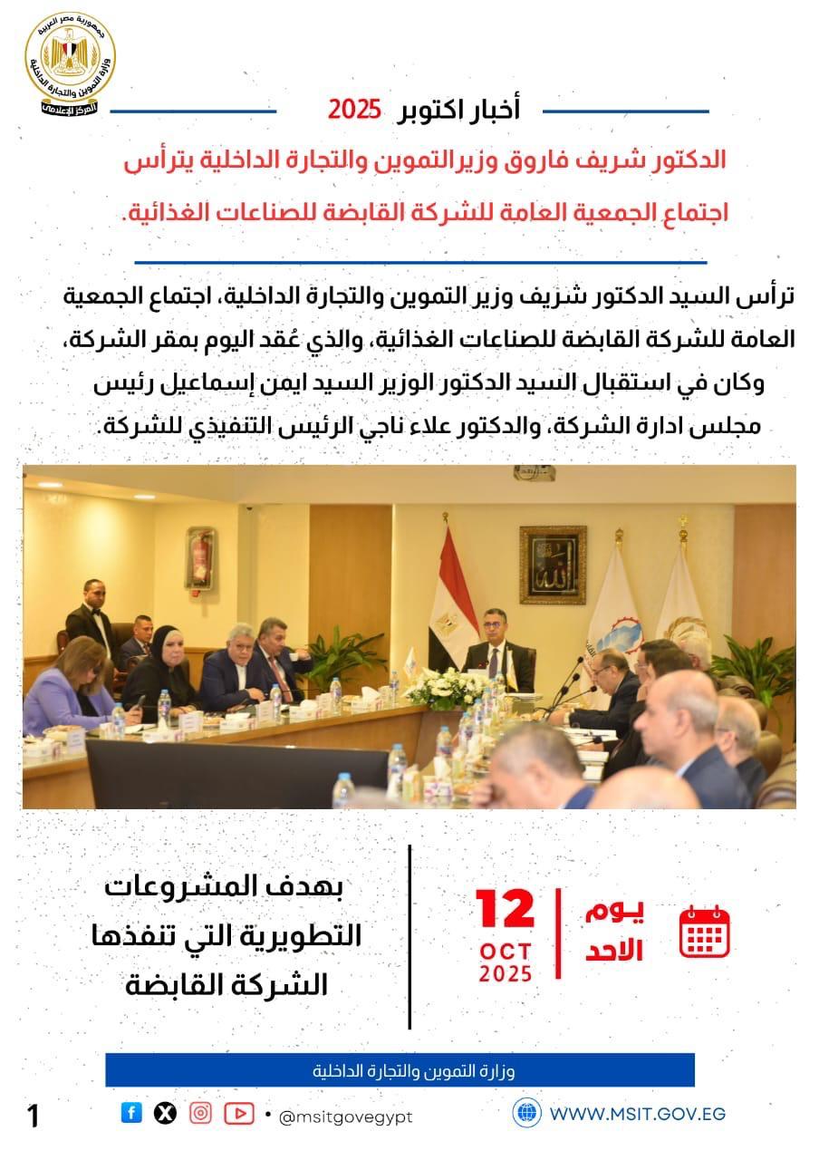 ترأس الدكتور شريف فاروق وزير التموين والتجارة الداخلية اجتماع الجمعية العامة للشركة القابضة للصناعات الغذائية، بحضور أعضاء الجمعية العامة وأعضاء مجلس الإدارة، وذلك لمتابعة أعمال التطوير ورفع كفاءة الأداء بالشركات التابعة.