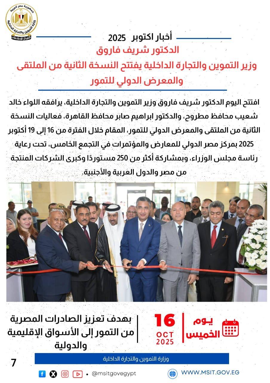 وعلى صعيد آخر، افتتح الوزير النسخة الثانية من الملتقى والمعرض الدولي للتمور بمركز مصر الدولي للمعارض بالقاهرة، بمشاركة أكثر من 250 شركة ومستوردًا من مصر والدول العربية والأجنبية، مؤكدًا أن قطاع التمور يمثل نموذجًا ناجحًا للتكامل بين الزراعة والصناعة والتجارة.