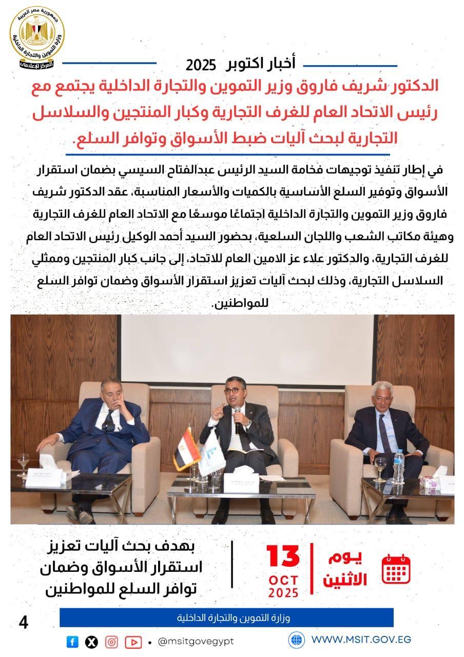 وفي إطار تنفيذ توجيهات القيادة السياسية بضبط الأسواق وتوافر السلع، عقد الوزير اجتماعًا موسعًا مع رئيس الاتحاد العام للغرف التجارية وكبار المنتجين والسلاسل التجارية، لبحث آليات استقرار الأسواق وضمان توافر السلع بأسعار مناسبة للمواطنين.