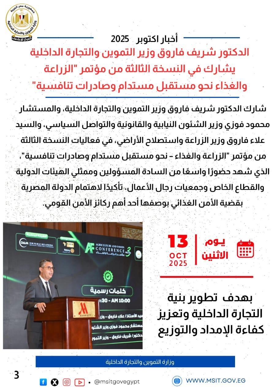 كما شارك الدكتور شريف فاروق في فعاليات النسخة الثالثة من مؤتمر “الزراعة والغذاء – نحو مستقبل مستدام وصادرات تنافسية”، بمشاركة وزراء الزراعة والشؤون النيابية ومسؤولي الهيئات الدولية والقطاع الخاص، مؤكدًا أن الأمن الغذائي ركيزة أساسية من ركائز الأمن القومي، وأن الوزارة نجحت في إطلاق البورصة المصرية للسلع وتطوير منظومات التخزين لتحقيق الاستدامة.