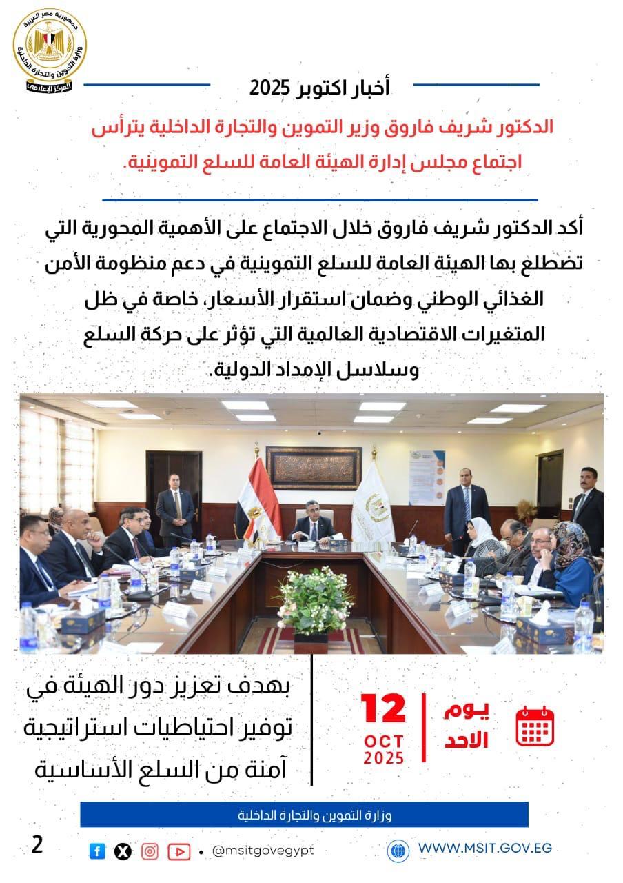 وفي سياق متصل، ترأس الوزير اجتماع مجلس إدارة الهيئة العامة للسلع التموينية بحضور قيادات الوزارة والهيئة، لمناقشة سبل تعزيز الاحتياطي الاستراتيجي من السلع الأساسية وضمان استقرار الأسواق.