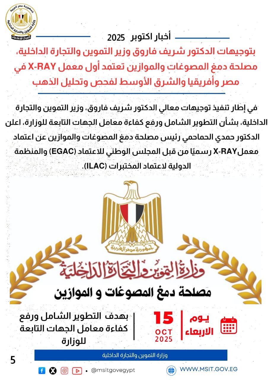 وبتوجيهات الدكتور شريف فاروق، اعتمدت مصلحة دمغ المصوغات والموازين أول معمل X-RAY في مصر وأفريقيا والشرق الأوسط لفحص وتحليل الذهب، بعد اعتماده رسميًا من المجلس الوطني للاعتماد والمنظمة الدولية لاعتماد المختبرات، ليُعد خطوة نوعية في تطوير منظومة الفحص والجودة.