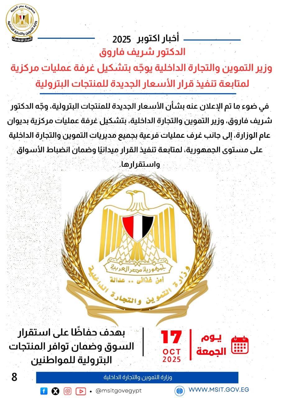 واختُتمت أنشطة الأسبوع بتوجيه الوزير بتشكيل غرفة عمليات مركزية بديوان عام الوزارة، وغرف فرعية بالمديريات، لمتابعة تنفيذ قرار الأسعار الجديدة للمنتجات البترولية وضمان استقرار الأسواق