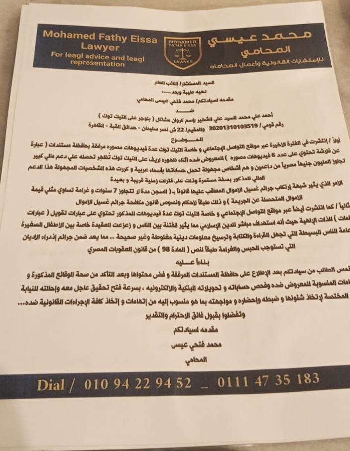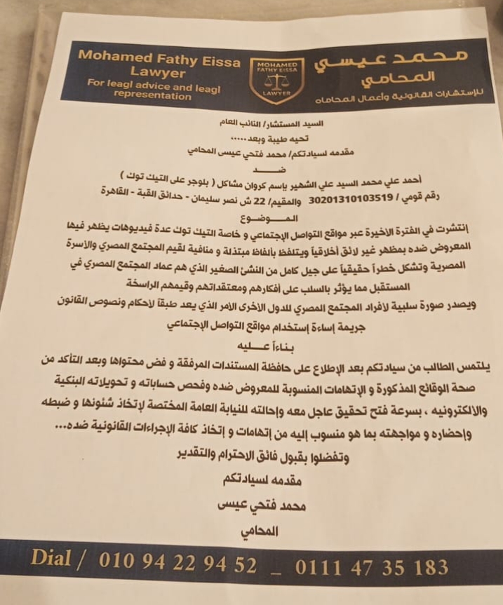 بلاغات مقدمة من المحامى محمد عيسى ضد التيك توكر احمد على محمد السيد المشهور بـ كروان مشاكل