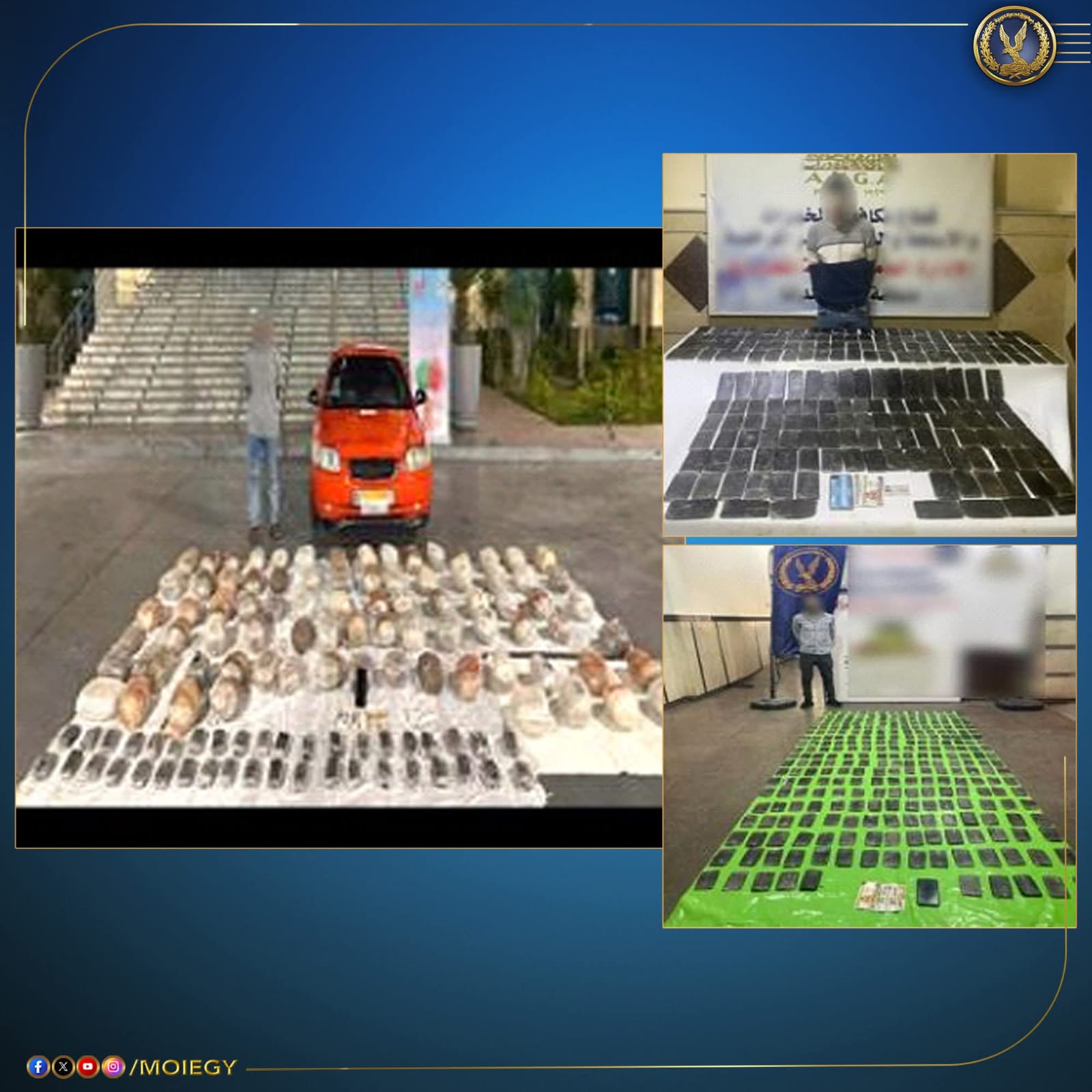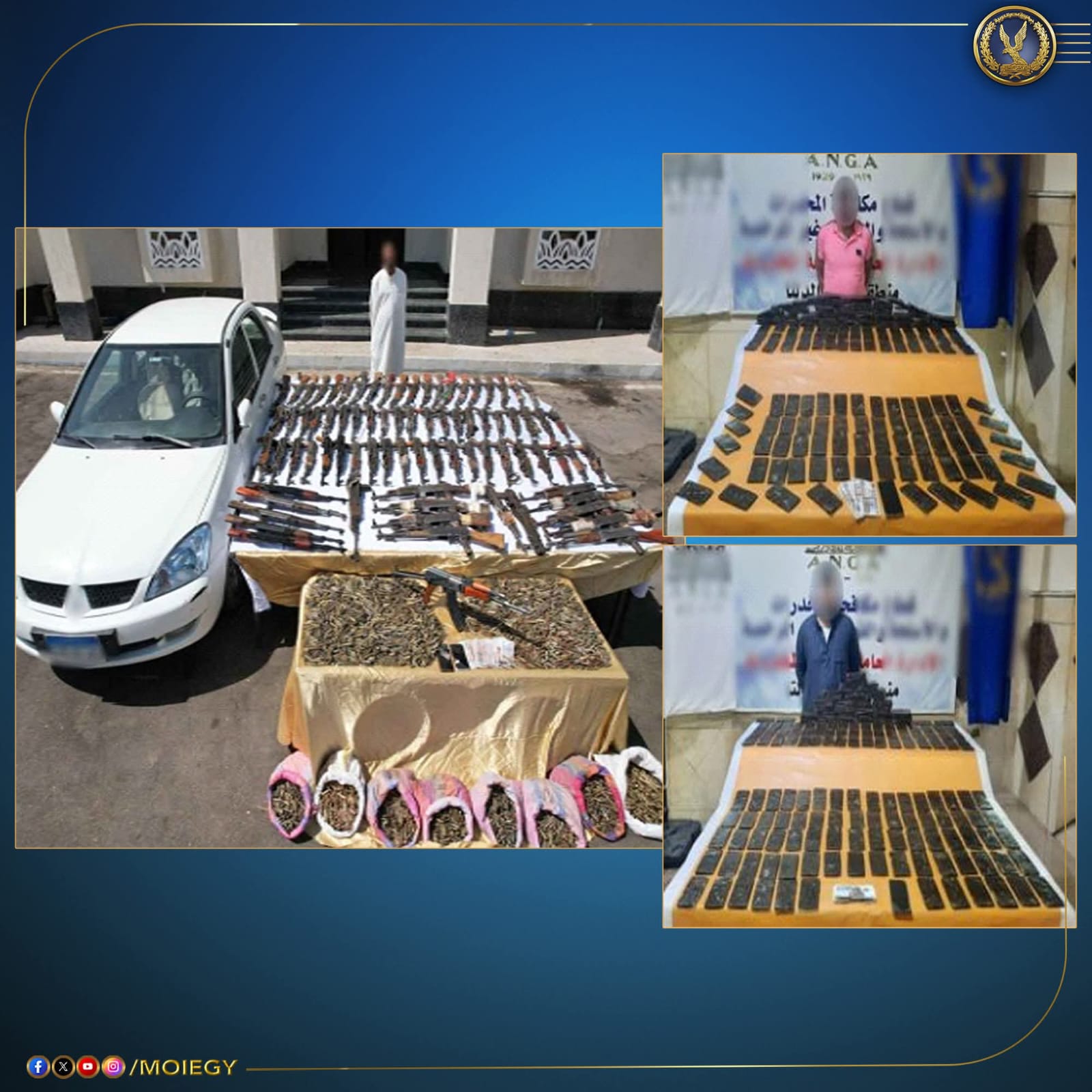 فى إطار مواصلة وزارة الداخلية توجيه الضربات الإستباقية للبؤر الإجرامية جالبى ومتجرى المواد المخدرة والأسلحة النارية غير المرخصة فقد أكدت معلومات وتحريات قطاعى الأمن العام ومكافحة المخدرات والأسلحة والذخائر غير المرخصة بالتنسيق مع أجهزة الوزارة المعنية قيام بؤر إجرامية بنطاق عدد من المحافظات تضم عناصر جنائية شديدة الخطورة بجلب كميات من المواد المخدرة الأسلحة النارية غير المرخصة تمهيداً للإتجار بها وعقب تقنين الإجراءات تم إستهدافهم بمشاركة قطاع الأمن المركزى، وقد أسفر التعامل عن مصرع عنصرين جنائيين شديدى الخطورة، محكوم عليهما بالسجن فى جنايات " إتجار بالمخدرات، سلاح نارى، سرقة بالإكراه بنطاق محافظة #قنا وضبط باقى عناصر تلك البؤر ، وبحوزتهم 770 كيلو جرام من المواد المخدرة المتنوعة "حشيش – شابو - هيدرو – هيروين و89 قطعة أسلحة نارية "81 بندقية آلية و4 بنادق خرطوش و4 فرد خرطوش هذا وتقدر القيمة المالية للمواد المخدرة المضبوطة بقرابة 90 مليون جنيه. تم إتخاذ الإجراءات القانونية.