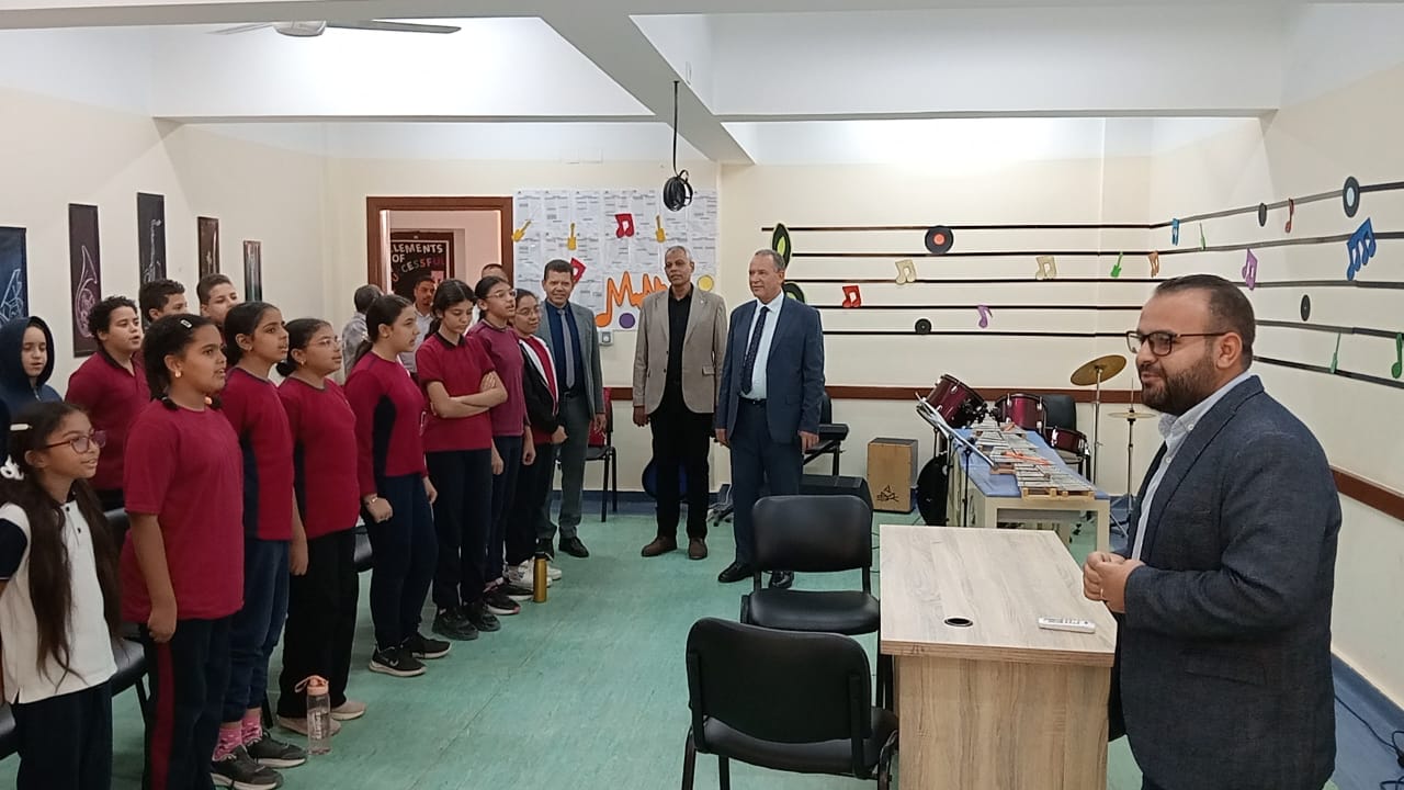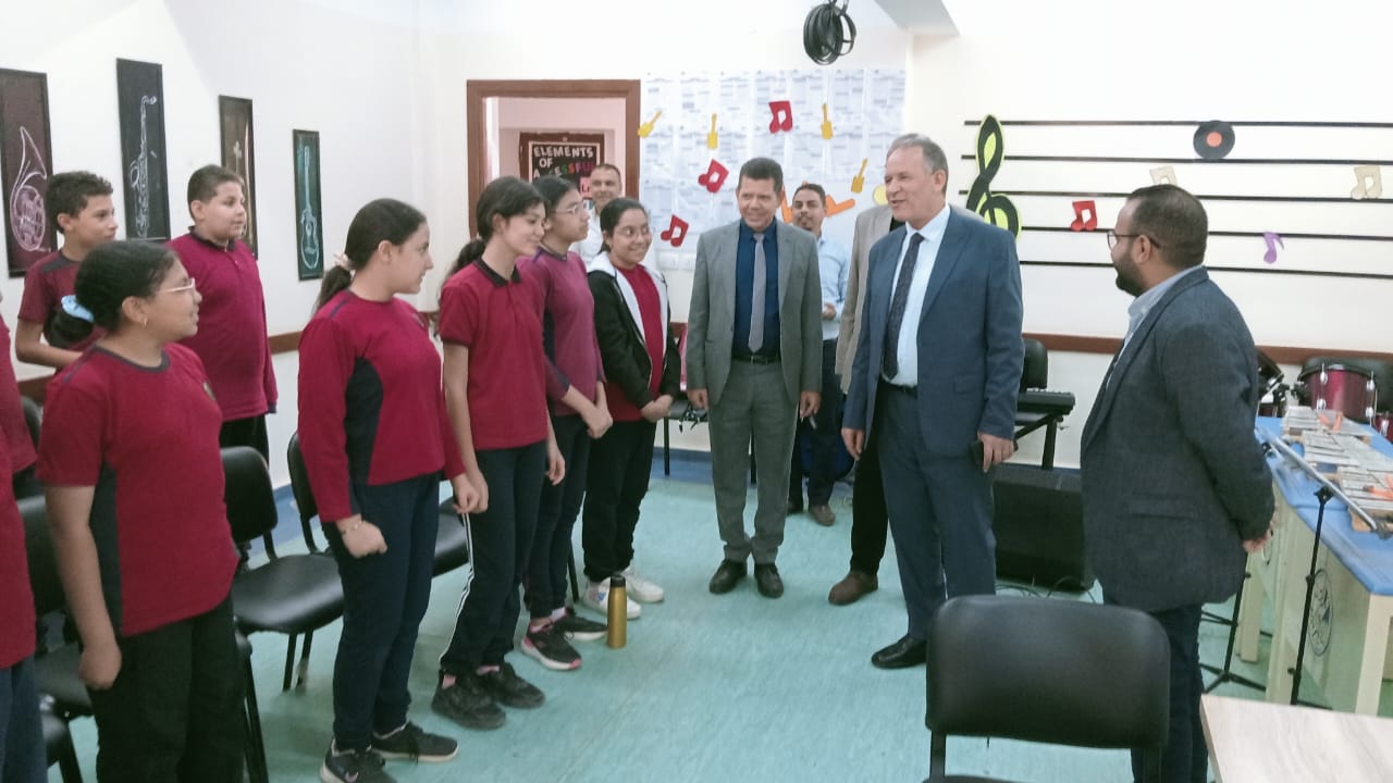 حيث استكمل وكيل الوزارة جولته بمدينة أسيوط الجديدة التى بدأها صباح اليوم الاثنين ، بزيارة مدرسة النيل المصرية الدولية والبالغ عدد فصولها 22 فصل دراسى و7 فصول رياض أطفال والتقى عادل مسعود مساعد مدير المدرسة وتفقد بعض الفصول الدراسية بالمراحل الإبتدائية والإعدادية والثانوية وتحاور مع التلاميذ واستمع إلى مشاركتهم مع المعلمين لافتاً إلى أهمية المشاركة والنقاش ولغة الحوار والفهم ، وشاركهم حصة اللغة الفرنسية وتحاور معهم ،مشيدا بمستوى الطلاب والمعلمين بالمدرسة ارتفاع مستوى الاداء والانضباط المدرسى وتوفير الوسائل التعليمية وحجرات الانشطة المختلف ،كما تابع بعض العروض الفنية وعرض لاغنية وطنية لطلاب المدرسة بحجرة النشاط الموسيقى مشيدا بمستوى الطلاب وتميزهم فى النشاط الموسيقى بالمدرسة وتفعيلهم للانشطة المدرسية .