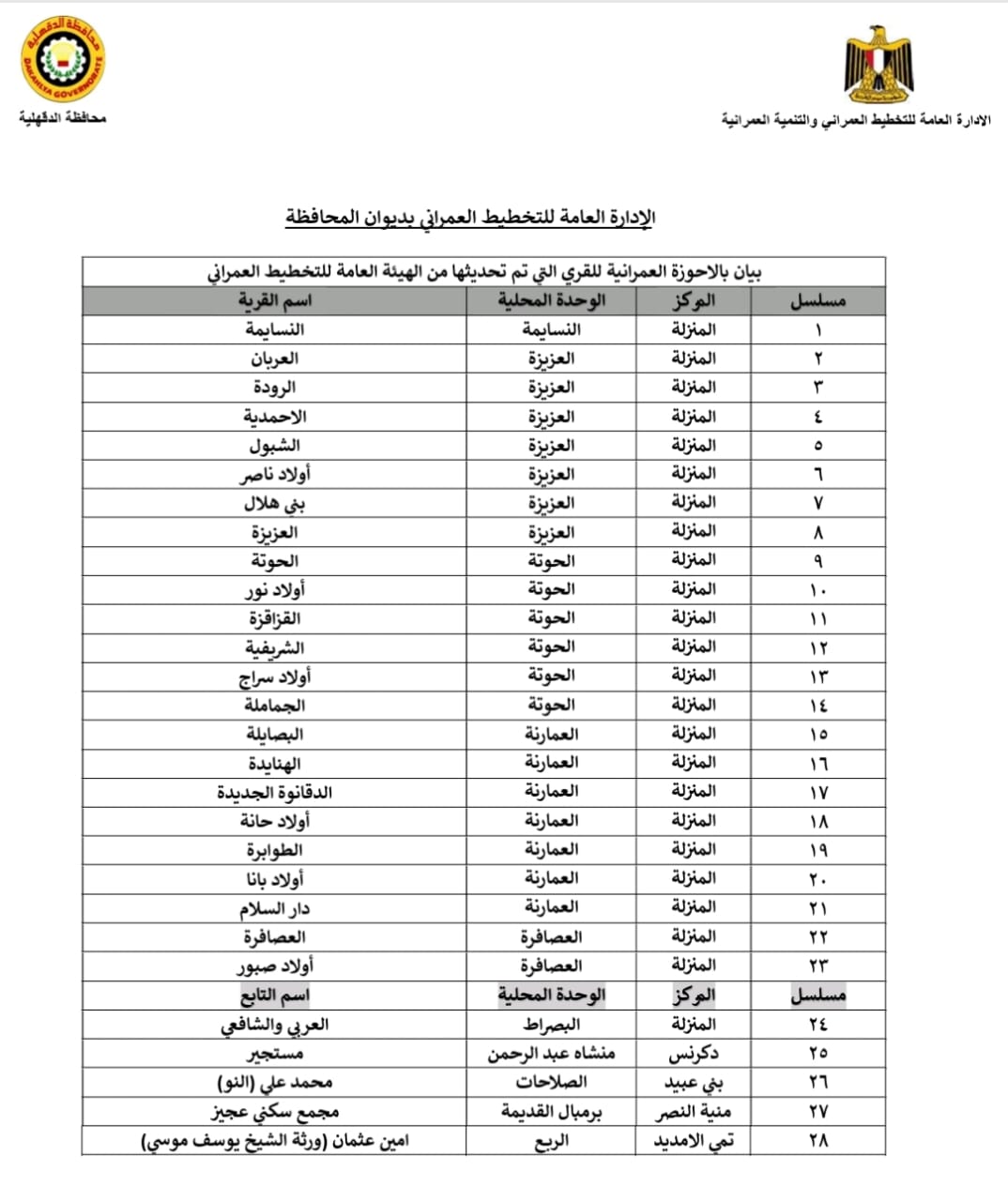 محافظ الدقهلية يعلن اعتماد الأحوزة العمرانية لـ 28 قرية وعزبة