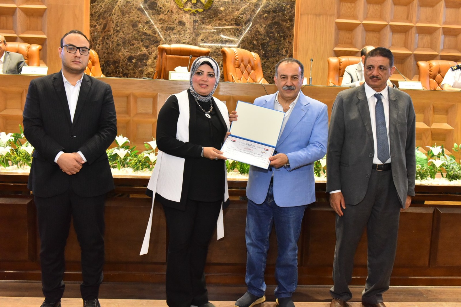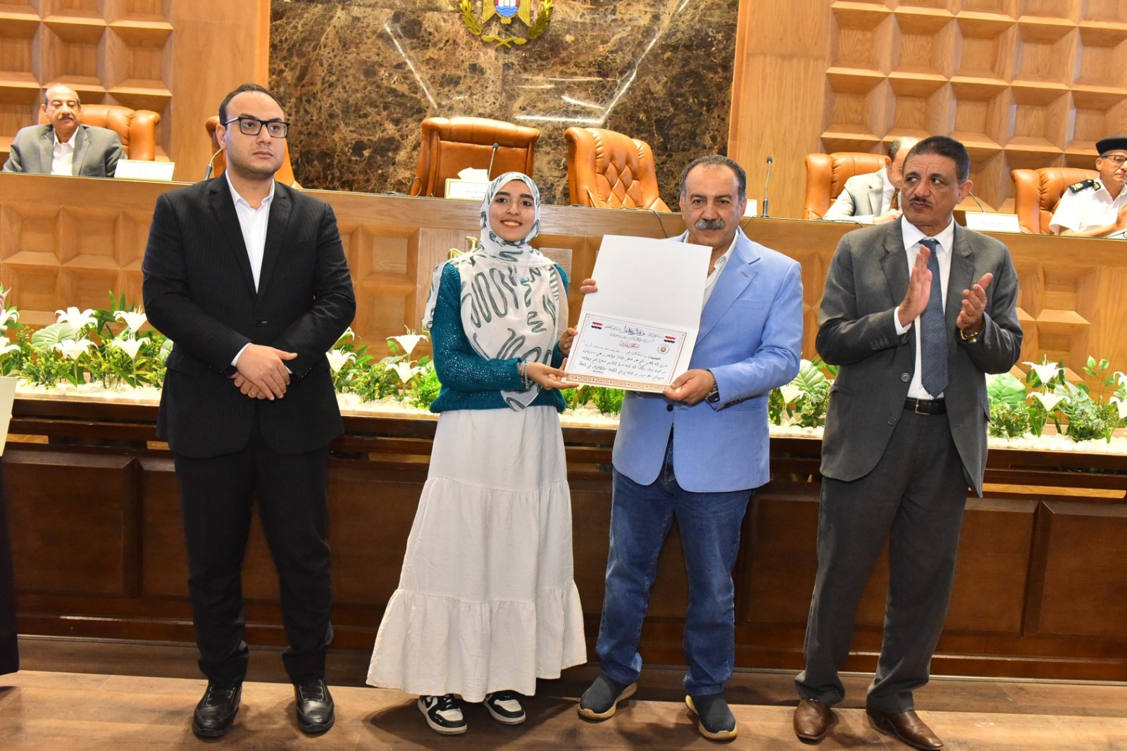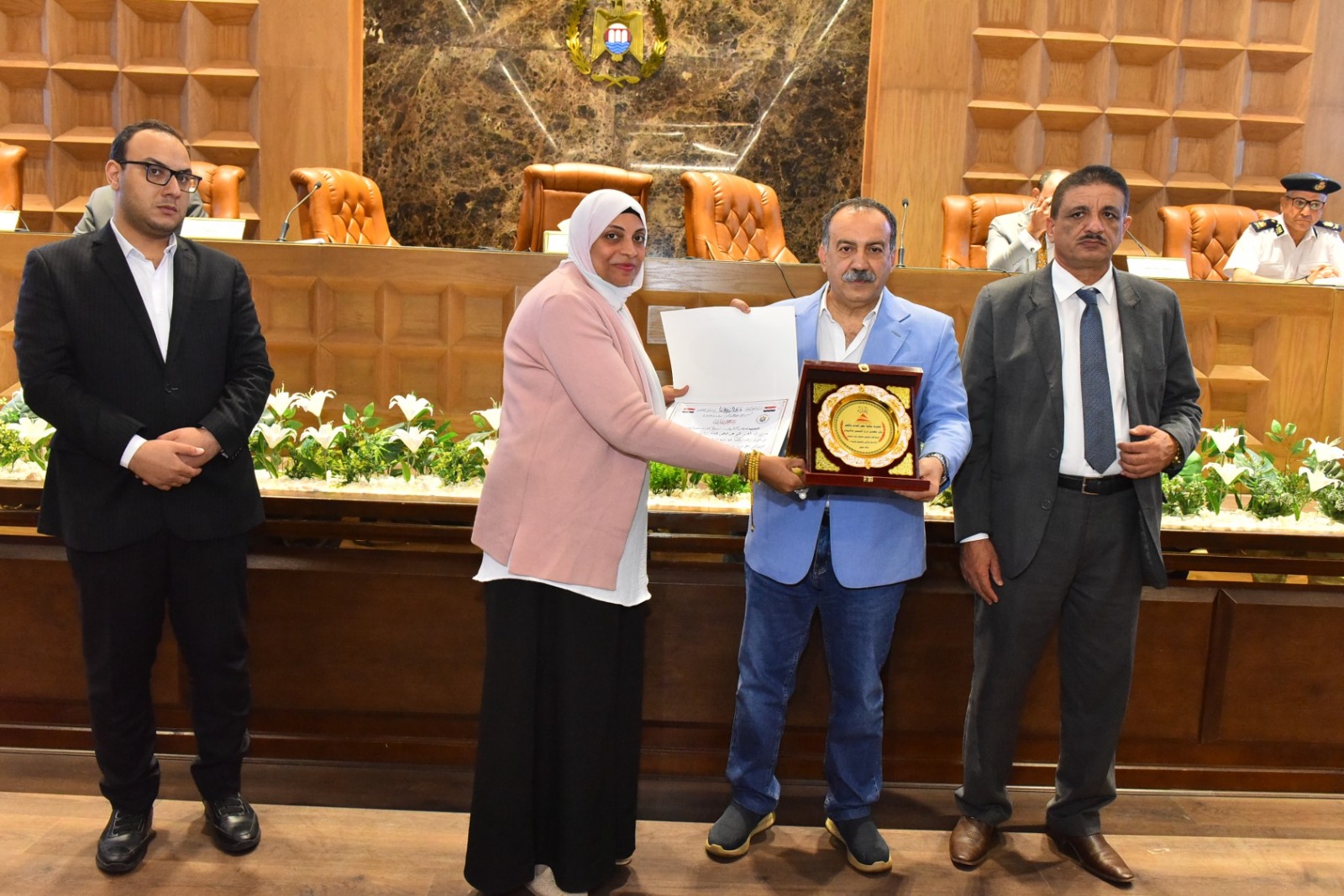 وخلال الجلسة، كرم المحافظ الفريق المشارك في فعاليات الملتقى الثاني بمكتبة مصر العامة الذي أقيم مؤخرًا بمحافظة الأقصر، وأسفر عن فوز مكتبة مصر العامة بأسيوط بدرع التميز والإبداع التراثي، كما تم تكريم كل من هاجر محروس مدير مكتبة مصر العامة، وناهد محمد فرغلي مدير إدارة التعاون بالمحافظة، وأحمد محمود موظف بالمكتبة، تقديرًا لجهودهم المتميزة في هذا الحدث الثقافي.