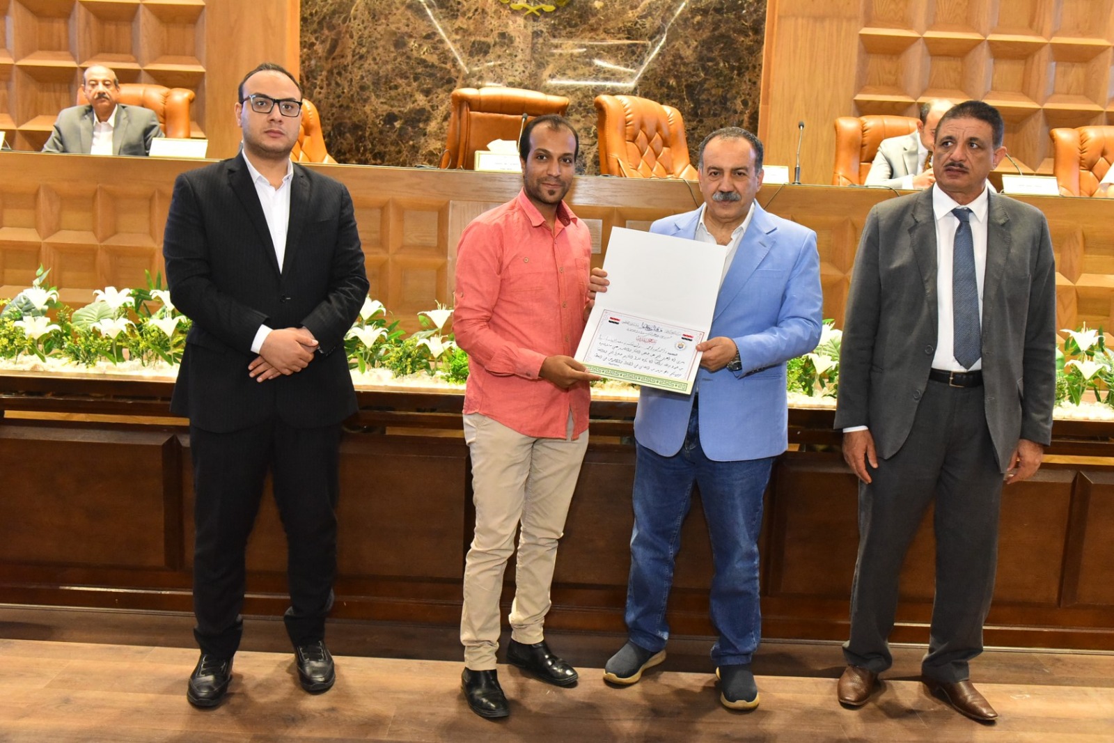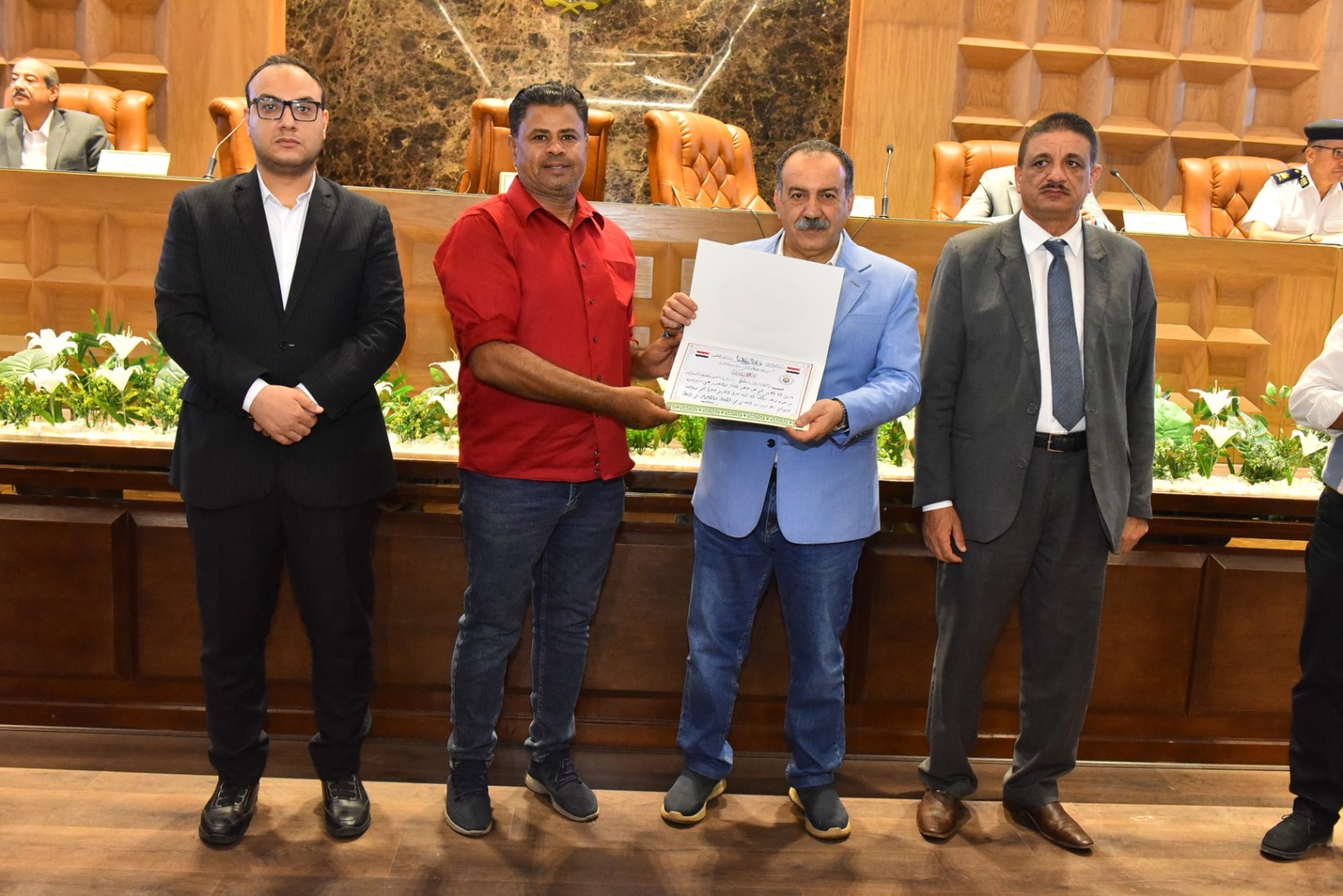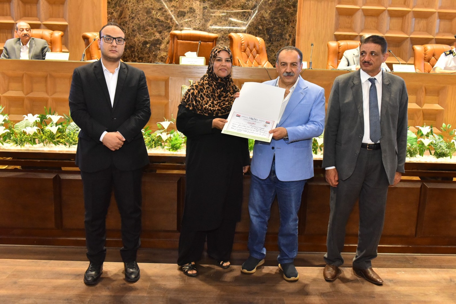 وخلال الجلسة، كرم المحافظ الفريق المشارك في فعاليات الملتقى الثاني بمكتبة مصر العامة الذي أقيم مؤخرًا بمحافظة الأقصر، وأسفر عن فوز مكتبة مصر العامة بأسيوط بدرع التميز والإبداع التراثي، كما تم تكريم كل من هاجر محروس مدير مكتبة مصر العامة، وناهد محمد فرغلي مدير إدارة التعاون بالمحافظة، وأحمد محمود موظف بالمكتبة، تقديرًا لجهودهم المتميزة في هذا الحدث الثقافي.