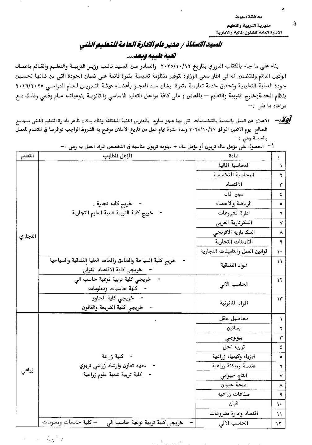 مدير تعليم أسيوط يعلن تلقى طلبات الراغبين فى العمل بالحصة بمدارس التعليم الفنى لمدة عشرة أيام