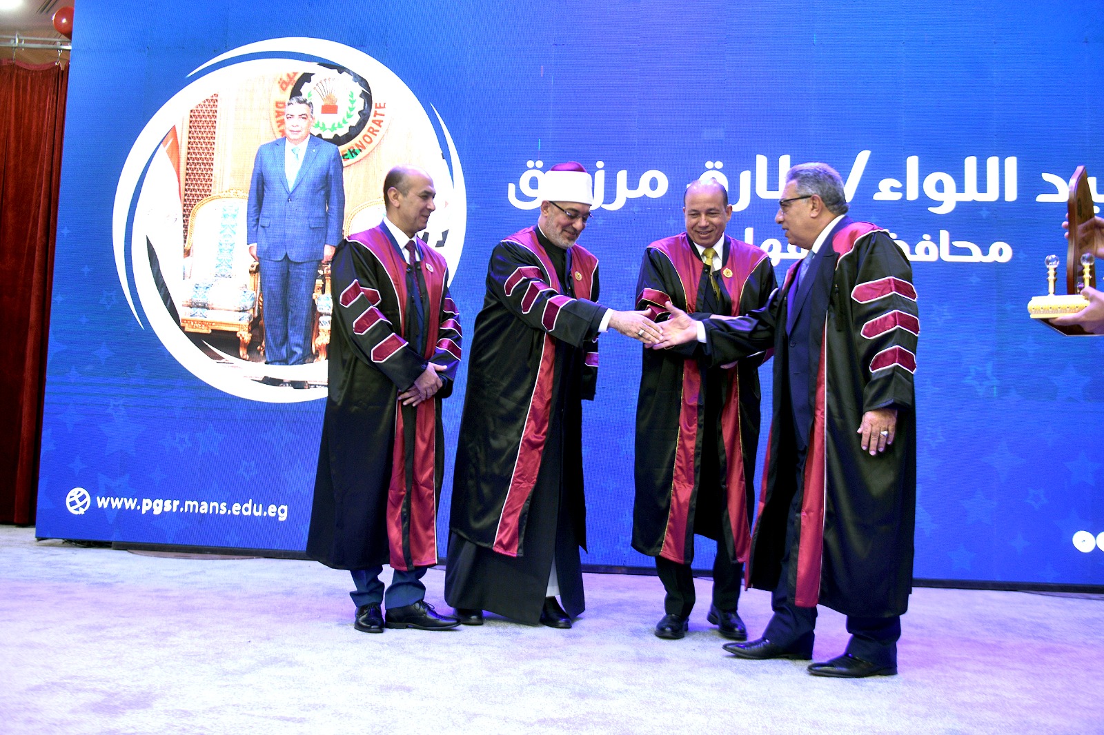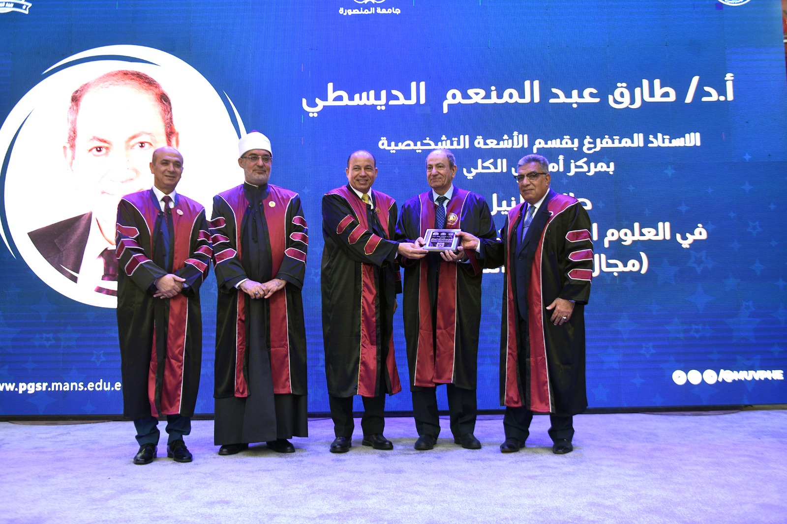 محافظ الدقهلية ورئيس جامعة المنصوره ومفتي الجمهورية يشهدون مؤتمر عيد العلم السادس عشر لجامعة المنصوره وتكريم المتميزين من العلماء والباحثين .
