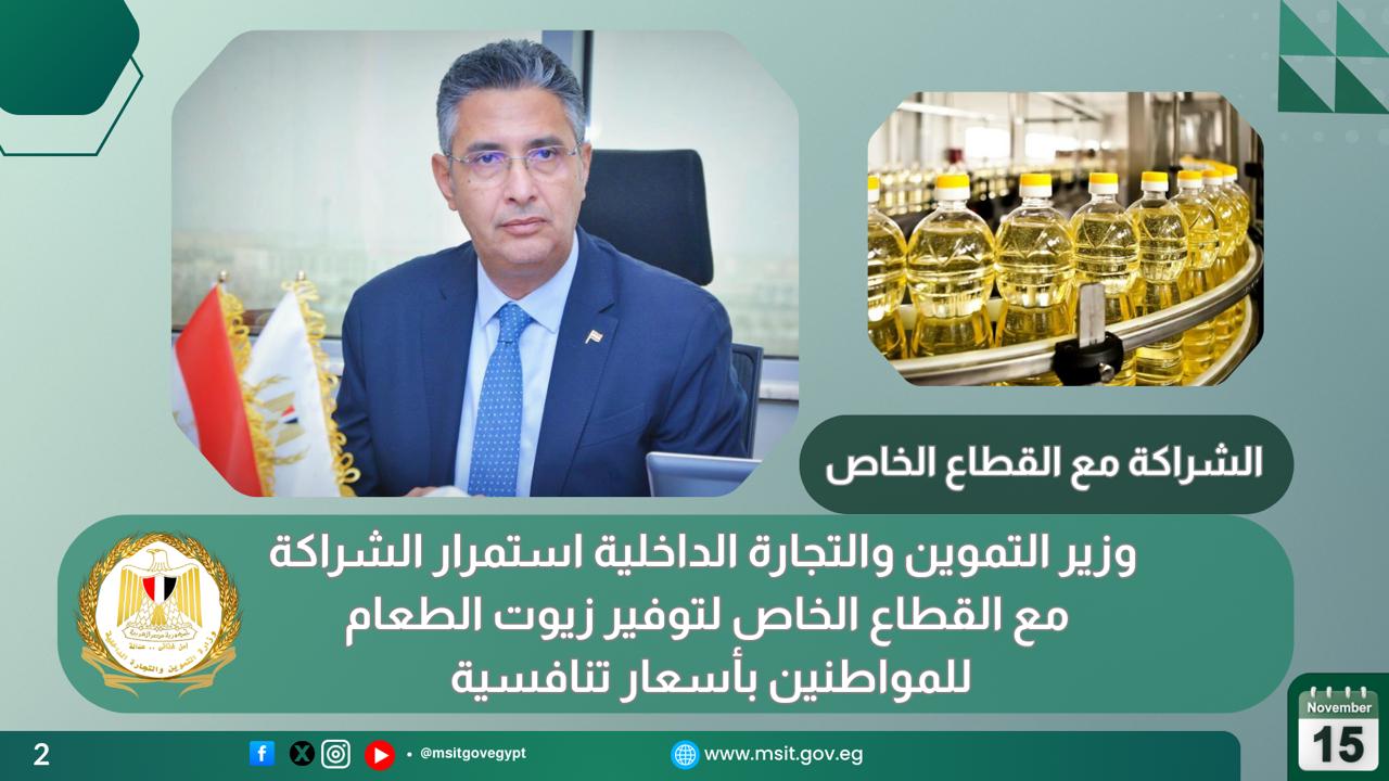 أعلن الدكتور شريف فاروق عن التوصل لاتفاق موسع مع شركات القطاع الخاص لضخ كميات إضافية من زيت الطعام داخل المجمعات الاستهلاكية، وتشمل طرح عبوة زيت خليط سعة ٧٠٠ مللي بسعر ٤٦.٦ جنيه فقط ويأتي هذا التعاون ضمن خطة الوزارة للتدخل الإيجابي في السوق من خلال زيادة المعروض وتحقيق توازن حقيقي في الأسعار، خاصة في ظل الاهتمام برفع جودة المنتجات المطروحة للمواطنين وتوفير بدائل متعددة بأسعار مناسبة