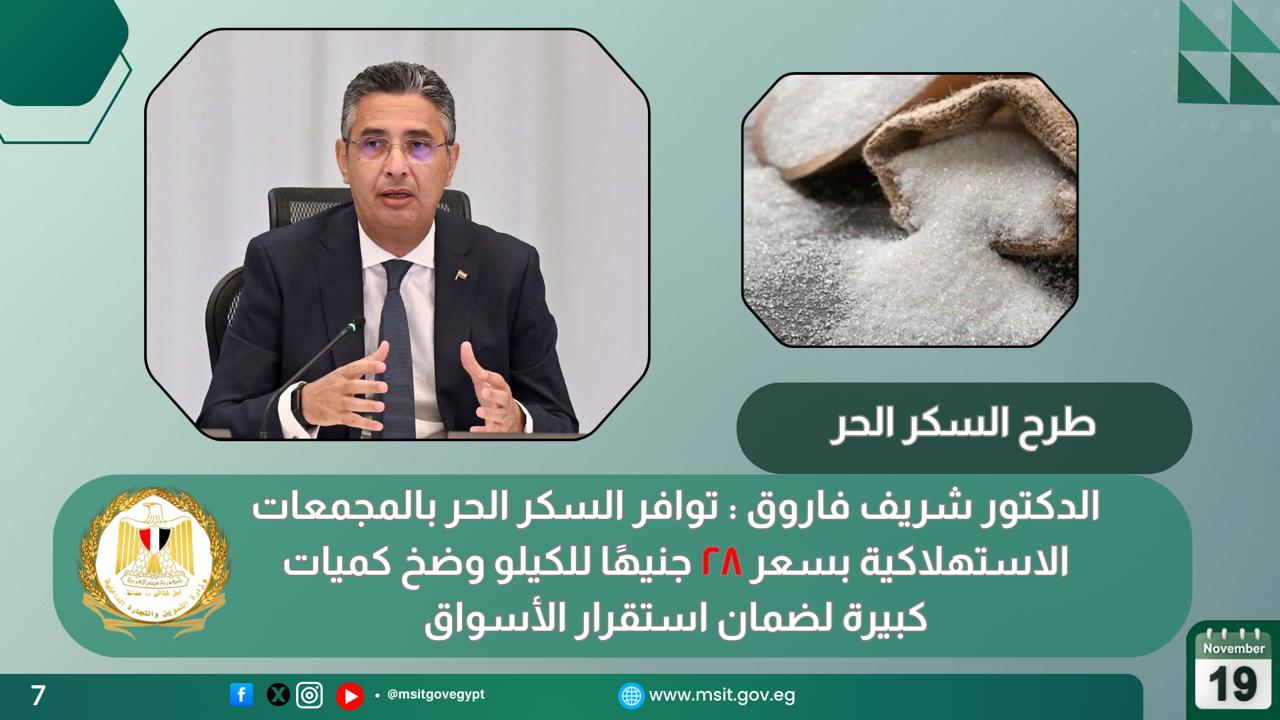 أكد وزير التموين أن السكر الحر متوفر بكميات كبيرة في جميع المجمعات الاستهلاكية على مستوى الجمهورية بسعر ٢٨ جنيهًا للكيلو، مع استمرار الدفع بكميات إضافية لمنع أي محاولات لاحتكار أو رفع الأسعار