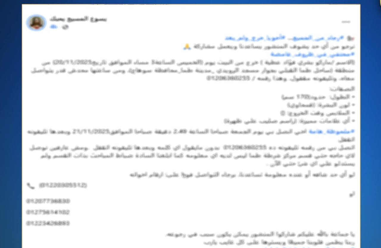 فى إطار كشف حقيقة منشور تم تداوله بمواقع التواصل الإجتماعى تضمن إستغاثة القائم على النشر بتغيب شقيقه بسوهاج.