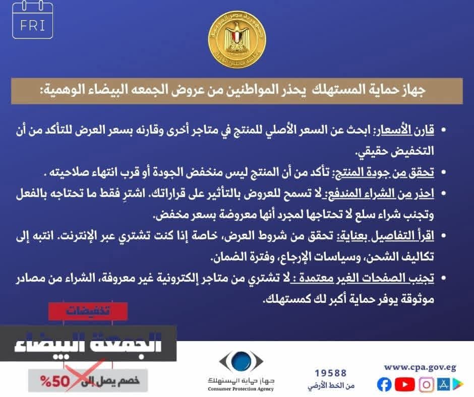 يُجدد جهاز حماية المستهلك دعوته للمواطنين بضرورة توخي الحذر عند التعامل مع عروض التخفيضات والمشتريات، سواء عبر المنصات الإلكترونية أو داخل المحال التجارية، وذلك حفاظًا على حقوقهم وضمانًا لشفافية المعاملات خلال موسم "الجمعة البيضاء".