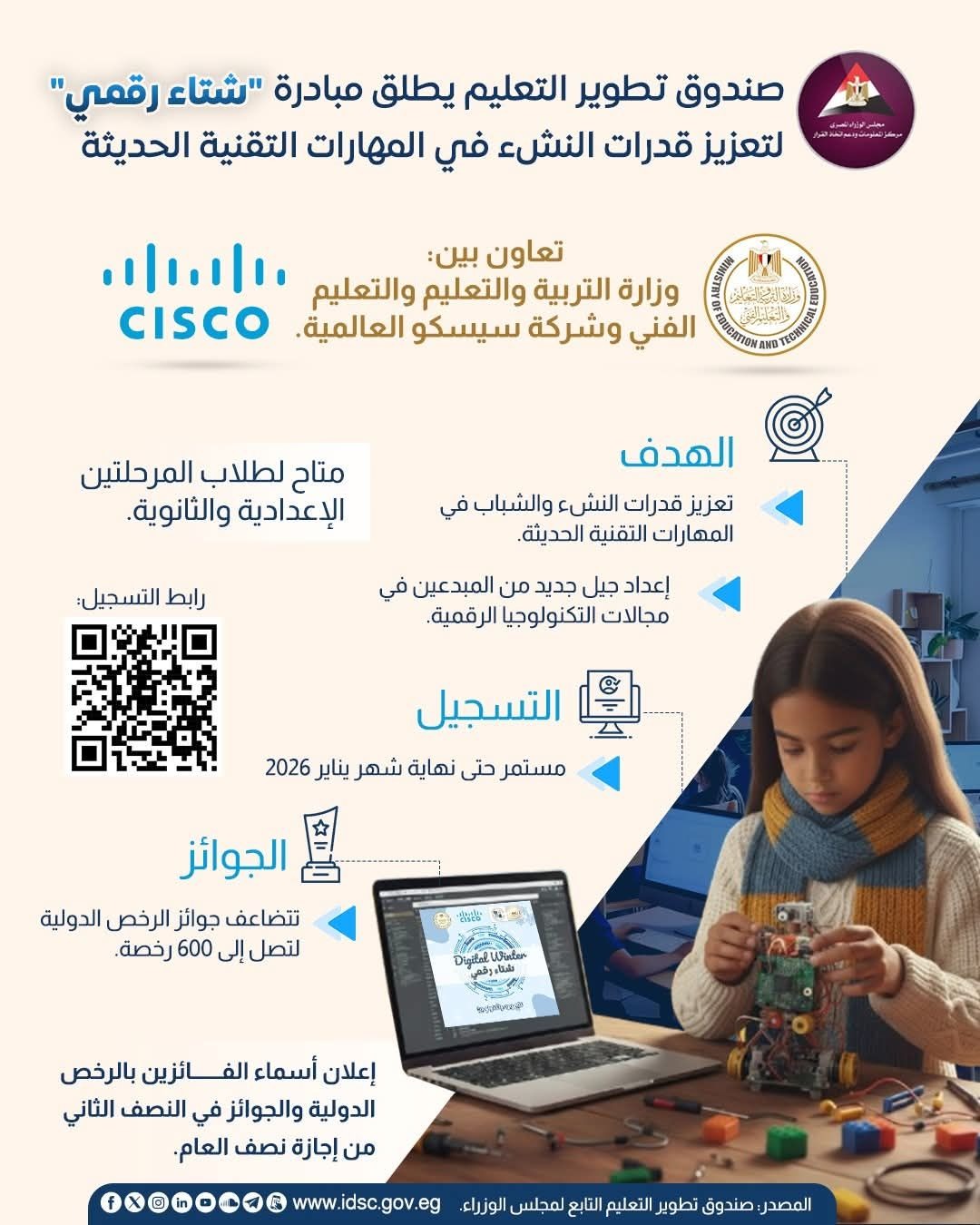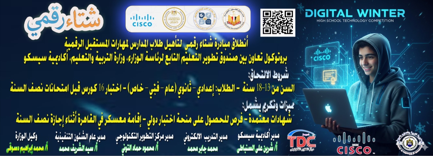"شتاء رقمى Digital Winter " والتى اطلقها صندوق تطوير التعليم التابع لرئاسة مجلس الوزراء و وزارة التربية والتعليم واكاديمية سيسكو العالمية ، لتأهيل طلاب المدارس لمهارات المستقبل الرقمية ،وذلك فى إطار الدعم المقدم من لواء دكتور هشام أبوالنصر محافظ أسيوط والسيد محمد عبد اللطيف وزير التربية والتعليم والتعليم الفنى ،وفى إطار حرص الدولة على تمكين النشء والشباب وبناء قدراتهم التكنولوجية وريادة الأعمال .
