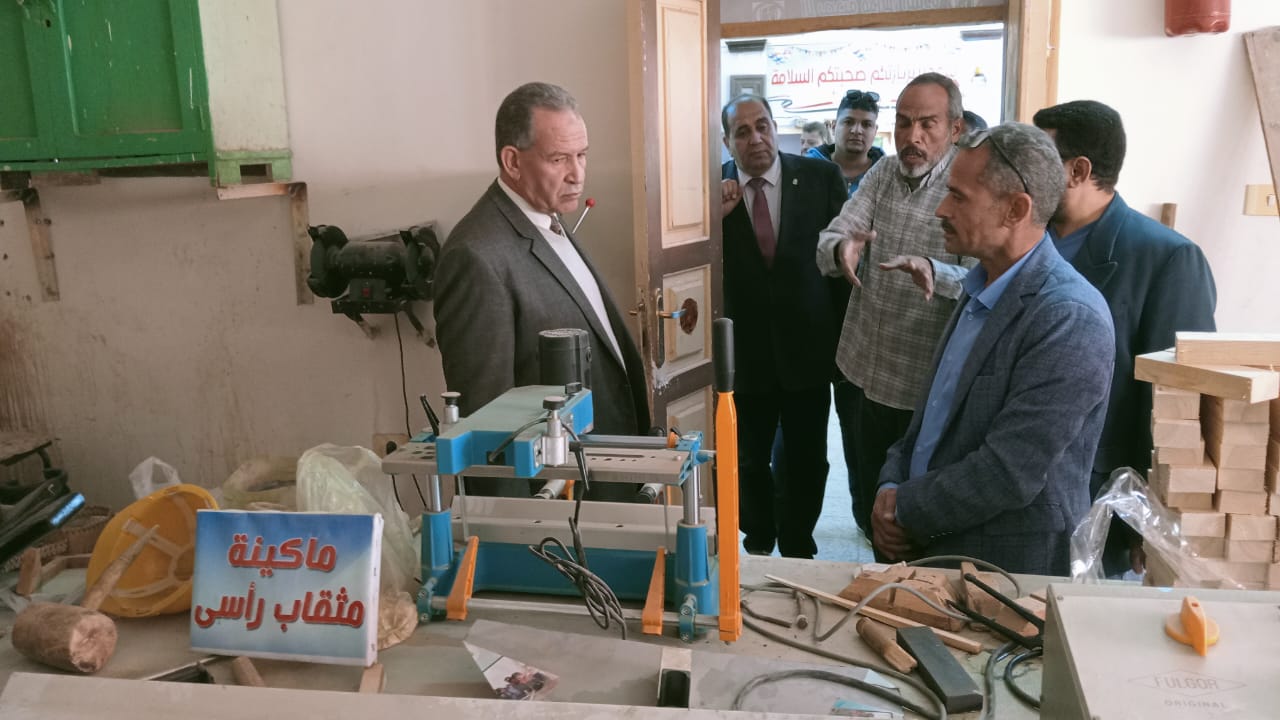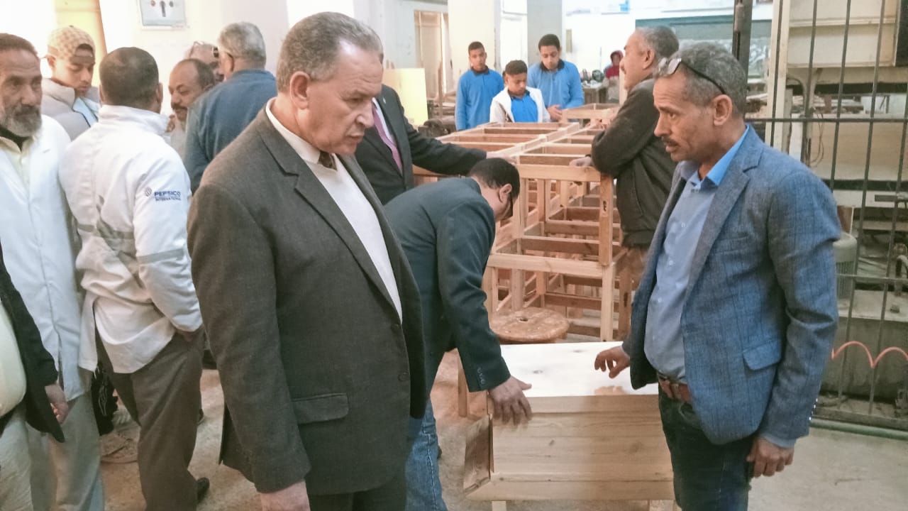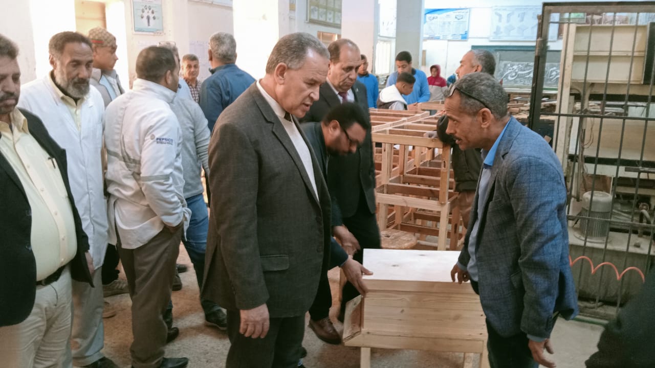 حيث بدأ وكيل الوزارة زيارته للمدرسة بتفقد اقسام وورش المدرسة وخاصة ورشة النجارة والالوميتال وتابع التدريب العملي للطلاب بورش النجارة وتشغيل الماكينات وكيفية تصنيعهم للمنتجات من خلال تدوير الرواكد الخشبية وتصنيع المقاعد وغرف النوم والباب والشباك والسلالم و الترابيزات وخلايا النحل ومستلزمات المناحل موجها بسرعة استغلال المخلفات الخشبية ورواكد المدارس الغير مستغلة و المتهالكة بمدارس المحافظة لتصنيع المنتجات الخشبية والأثاث المنزلى ومستلزمات الديكور الحديث تحت إشراف المعلمين المتخصصين بالمدرسة مشيدا بالمنتجات والمصنوعات وجودتها ورخص اسعارها بالمقارنة مع نظيراتها بالاسواق .
