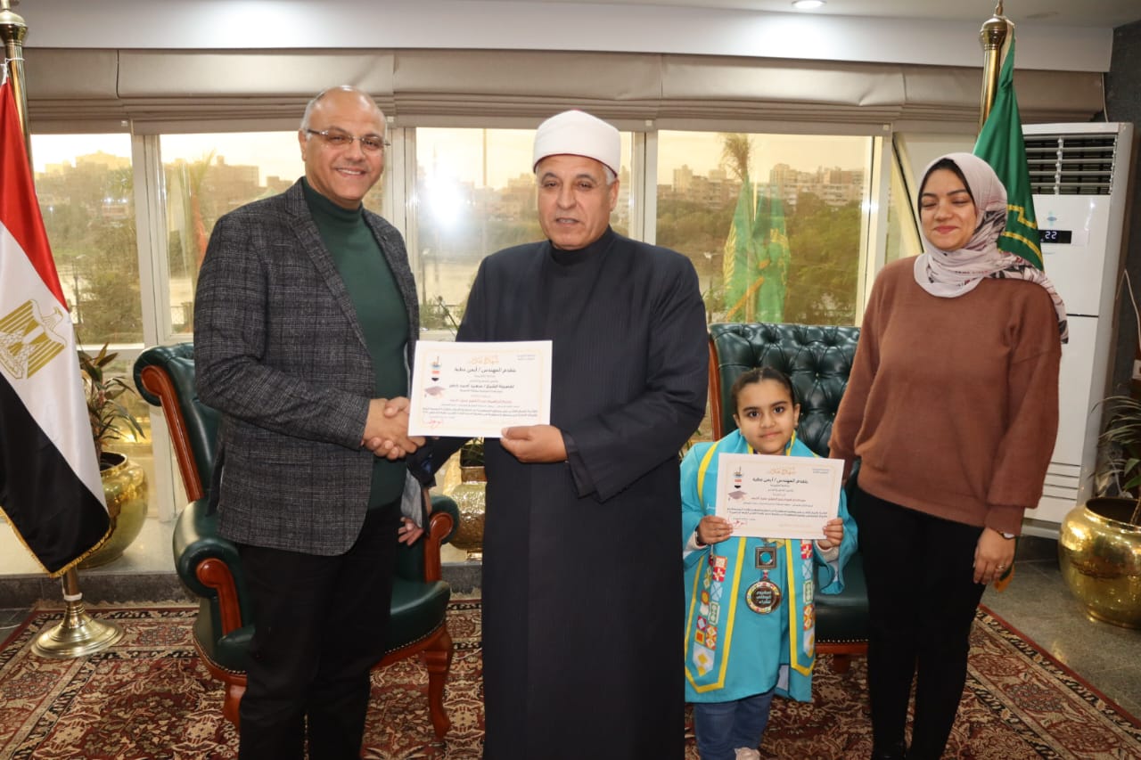 كما شمل التكريم أيضاً الشيخ سعيد أحمد خضر رئيس الإدارة المركزية بمنطقة القليوبية الأزهرية، والأستاذ ماهر محمدي منسق المشروع الوطني للقراءه، تقديراً لجهودهما في الإشراف والمتابعة وتوفير البيئة الداعمة التي ساهمت في تحقيق الطالبة مريم لهذه المراكز المتقدمة.