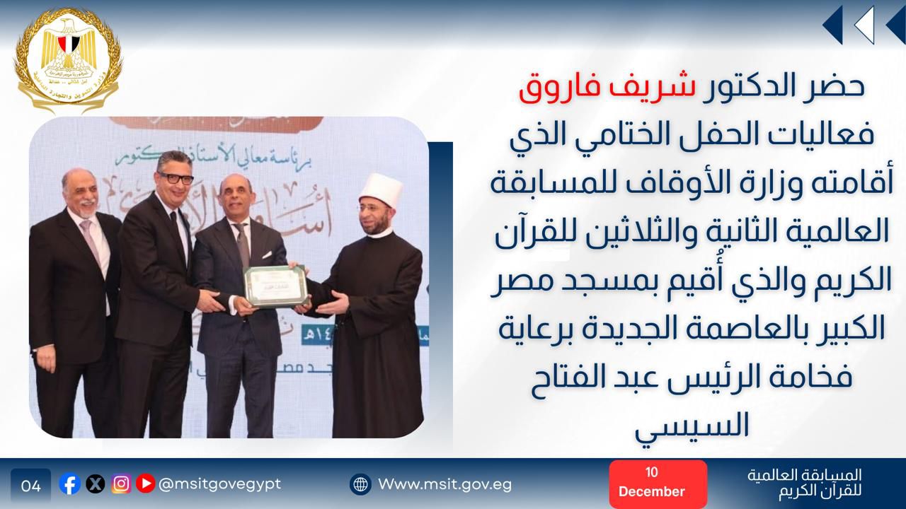 حضر الدكتور شريف فاروق فعاليات الحفل الختامي الذي أقامته وزارة الأوقاف للمسابقة العالمية الثانية والثلاثين للقرآن الكريم، والذي أُقيم بمسجد مصر الكبير بالعاصمة الجديدة، برعاية فخامة الرئيس عبد الفتاح السيسي، وبحضور لفيف من السادة الوزراء والقيادات الدينية والتنفيذية وممثلي السفارات.