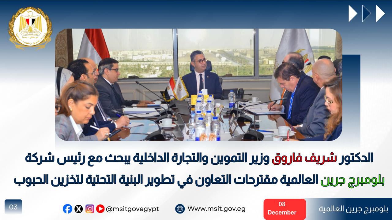 اجتمع الدكتور شريف فاروق مع السيد/ فيليب إف بلومبرج، رئيس مجلس الإدارة والرئيس التنفيذي لشركة بلومبرج جرين العالمية، والوفد المرافق له، للإطلاع على رؤية الشركة ومقترحاتها الفنية وخبراتها الدولية في مجال تطوير وتحديث البنية التحتية لتخزين وتداول الحبوب، في إطار بحث سبل الاستفادة من الخبرات العالمية بما يدعم منظومة الأمن الغذائي ورفع كفاءة سلاسل الإمداد.