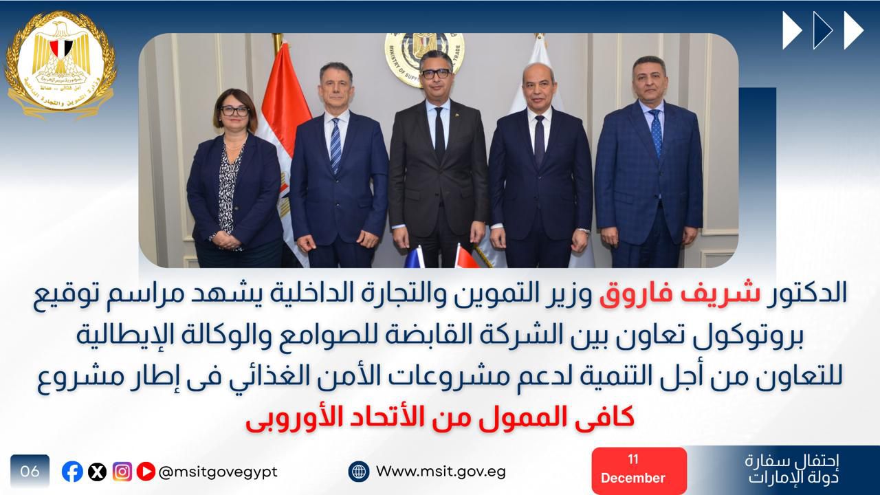 شهد الدكتور شريف فاروق وزير التموين والتجارة الداخلية، مراسم توقيع بروتوكول التعاون بين الشركة المصرية القابضة للصوامع والتخزين والوكالة الإيطالية للتعاون من أجل التنمية، وذلك بمقر الوزارة بالعاصمة الجديدة، في إطار تعزيز التعاون الدولي ودعم تطوير منظومة الأمن الغذائي ورفع كفاءة البنية التحتية للتخزين.