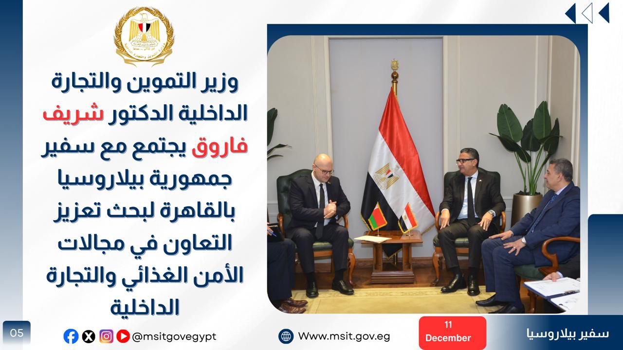 بمقر الوزارة بالعاصمة الجديدة استقبل الدكتور شريف فاروق، سفير جمهورية بيلاروسيا بالقاهرة السيد/ يفجيني سوبوليفسكي والوفد المرافق، وذلك لبحث سبل دعم وتعزيز التعاون بين البلدين في مجالات الأمن الغذائي، وتطوير سلاسل الإمداد، والتصنيع الغذائي، بما يتوافق مع توجهات الدولة المصرية نحو تنويع الشراكات الدولية وتعزيز استدامة توافر السلع الأساسية.