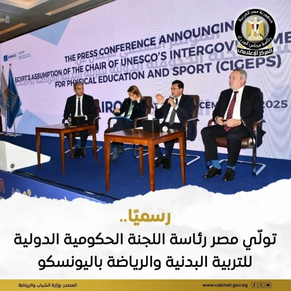 أعلنت وزارة الشباب والرياضة، عن تولّي جمهورية مصر العربية، ممثلة في السيد وزير الشباب والرياضة، رئاسة اللجنة الحكومية الدولية للتربية البدنية والرياضة (CIGEPS) التابعة لمنظمة اليونسكو.