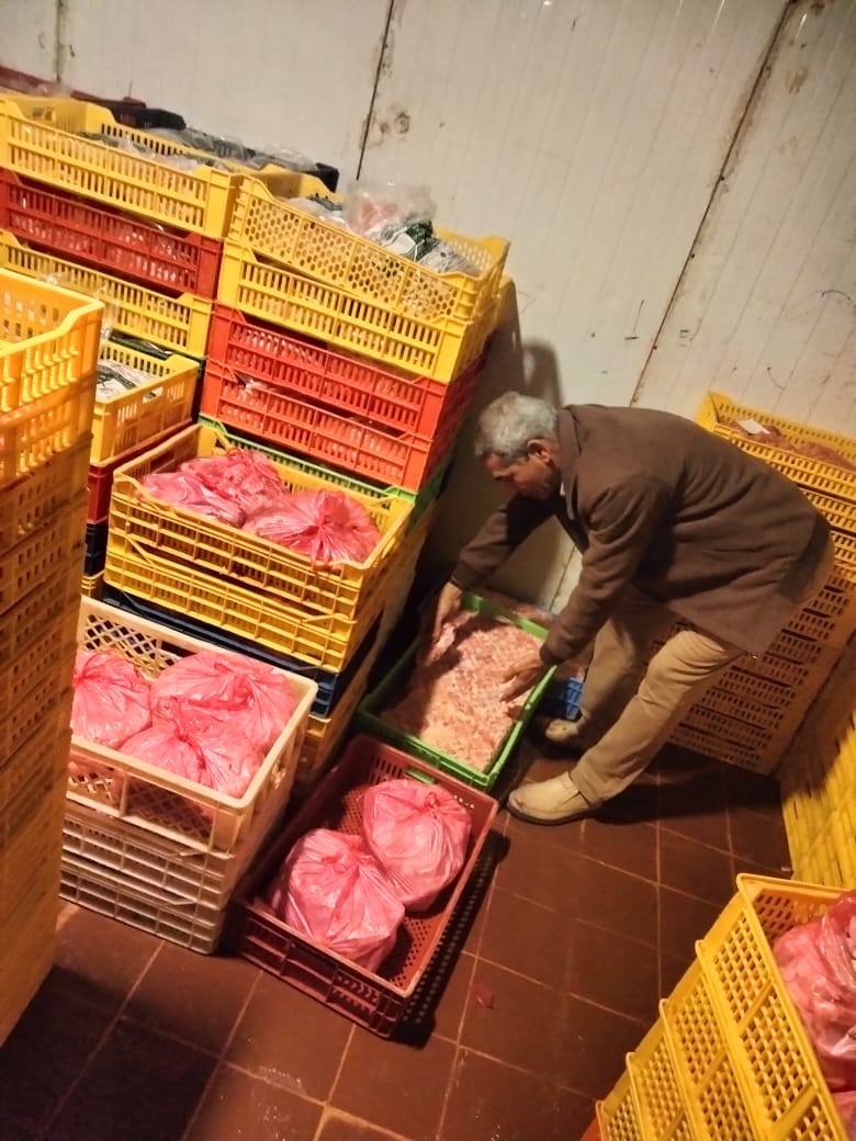 وبالفحص، تم ضبط كميات من أوراك وصدور وفيليه الدواجن غير المدون عليها أي بيانات، وبها سائل انفصالي مدمم، وذلك طبقًا لفحص السادة الأطباء البيطريين. وقد بلغ إجمالي المضبوطات (3110) كجم — ثلاثة أطنان ومائة وعشرة كيلوجرامات من أوراك وصدور وفيليه الدجاج.