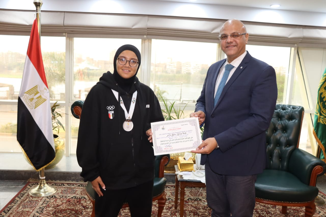 كرّم المهندس أيمن عطية، محافظ القليوبية، البطلة جنة صليح عامر، ابنة المحافظة، بعد فوزها بالميدالية البرونزية في منافسات قذف القرص بدورة الألعاب الأفريقية للناشئين التي أقيمت في أنجولا، والمؤهلة لأولمبياد الشباب "داكار 2026".