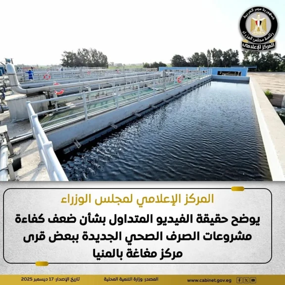 المركز الإعلامي لمجلس الوزراء يوضح حقيقة الفيديو المتداول بشأن ضعف كفاءة مشروعات الصرف الصحي الجديدة ببعض قرى مركز مغاغة بالمنيا