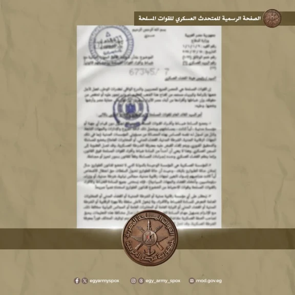 وتؤكد القوات المسلحة أن جيشكم هو جيش الشعب ، نابع من صلبه ومن تراب هذا الوطن الخالد ، ملتزم بأحكام الدستور وسيادة القانون ، وسيظل درعًا وسيفًا لحماية مصر وشعبها.