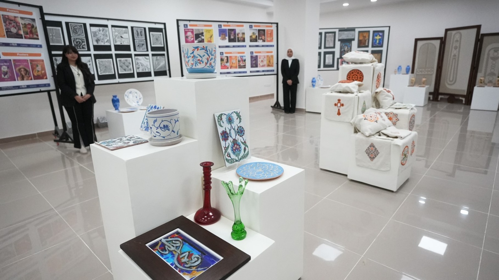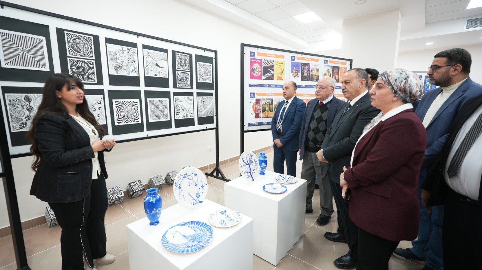 وتميز المعرض بمشاركة لافتة لقسم التصميم الداخلي والأثاث، من خلال تنفيذ أعمال تطبيقية من بينها "بارتشن" صممه ونفذه الطلاب بالكامل، بدءًا من الفكرة وحتى المنتج النهائي، مع توظيف الخامات المختلفة من الأخشاب الطبيعية والمصنعة، بما يجمع بين الجمال والوظيفة ومتطلبات الفراغ الداخلي كما ضم المعرض جداريات فنية اعتمدت على خامات متعددة، أظهرت قدرة الطلاب على التجريب والربط بين الكتل والفراغات، إلى جانب أعمال برنامج تصميم الوسائط والجرافيك، التي تناولت دائرة الألوان والحملات الإعلانية بأسلوب تطبيقي يعكس التكامل بين الإبداع الفني والتقنيات الرقمية الحديثة.