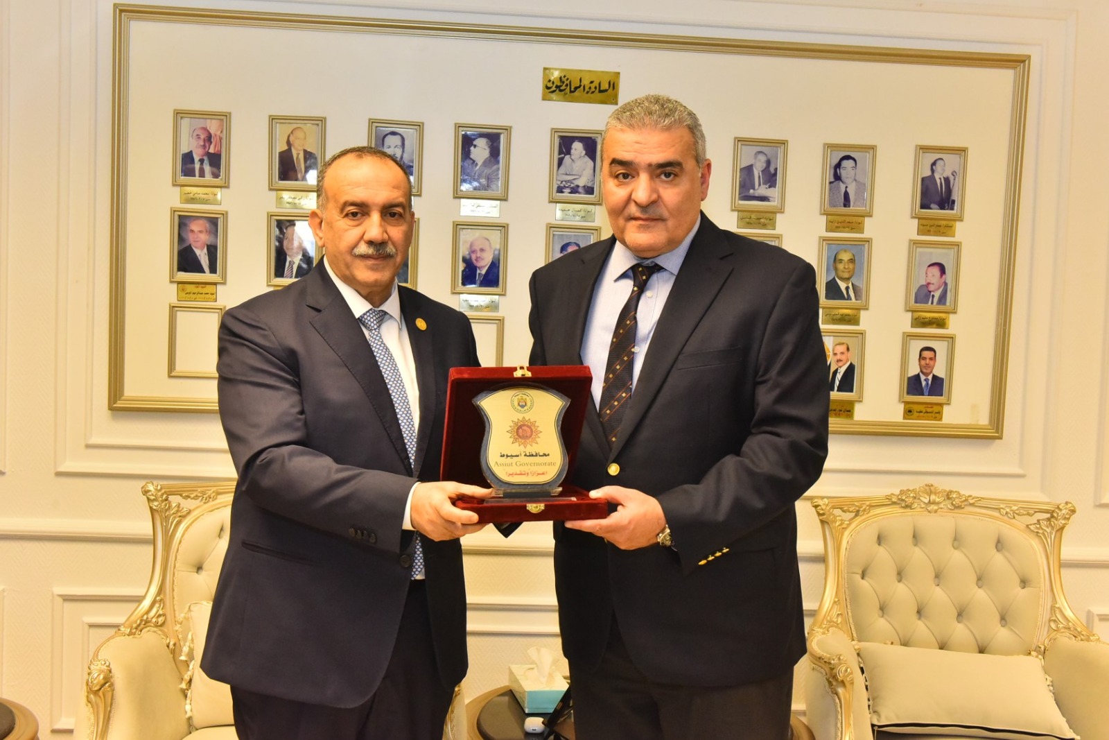 كما التقى محافظ أسيوط، بمكتبه بديوان عام المحافظة، وفد الشركة المصرية لتجارة الأدوية، حيث جرى تبادل الدروع التذكارية مع الدكتور أبو الفتوح الطويل، رئيس مجلس إدارة الشركة، تقديرًا للتعاون المشترك.