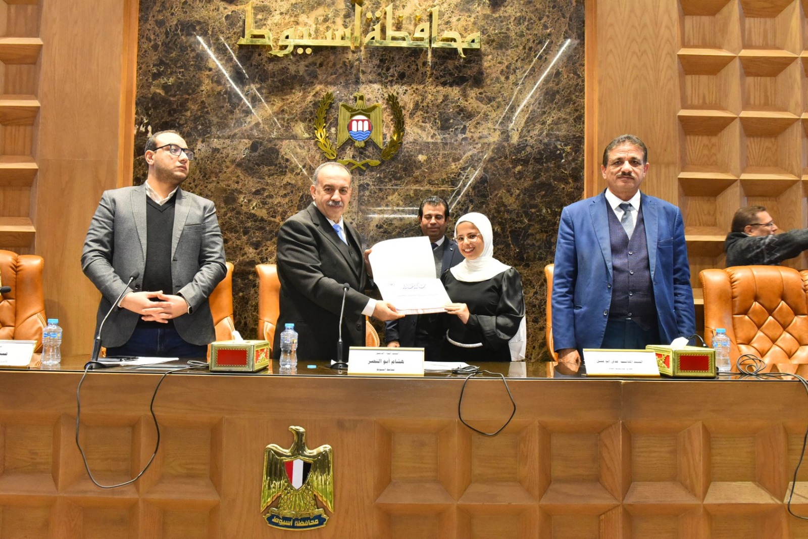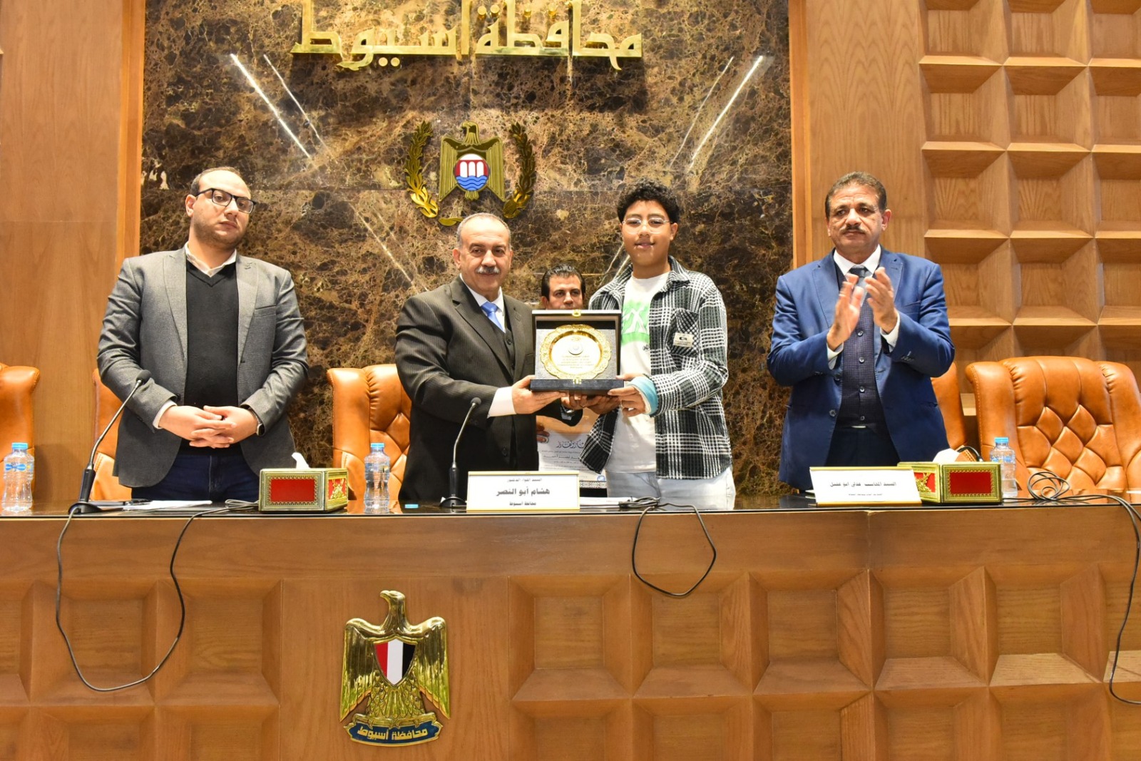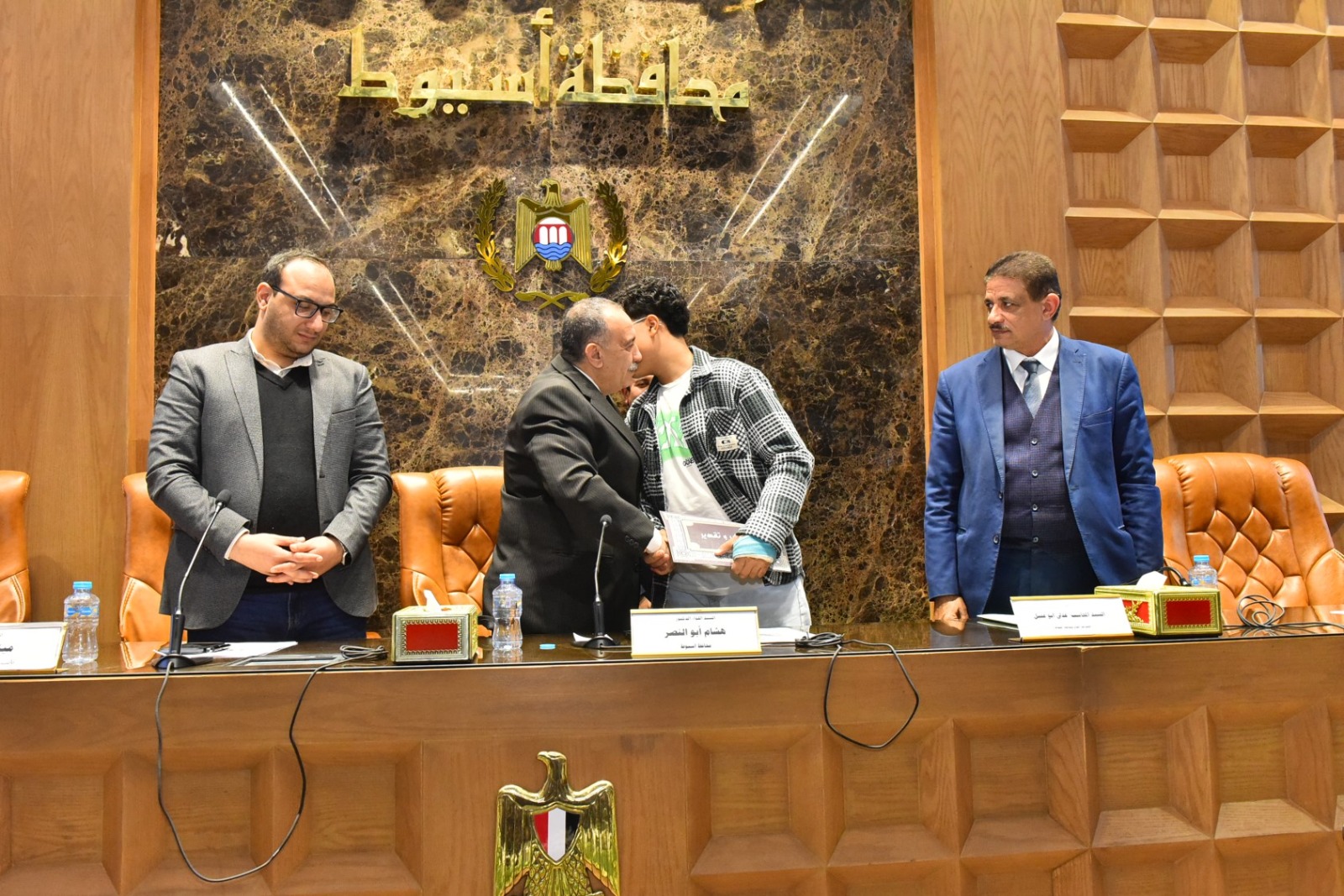 كرم اللواء دكتور هشام أبو النصر محافظ أسيوط اثنين من أبناء المحافظة من الطلاب المتميزين، تقديرًا لتفوقهما وحصولهما على مراكز متقدمة في مسابقات وطنية ودولية بمجالات الابتكار وتكنولوجيا المعلومات، وذلك خلال انعقاد جلسة المجلس التنفيذي للمحافظة بحضور الدكتور مينا عماد نائب المحافظ، والمحاسب عدلي أبو عقيل السكرتير العام، واللواء إسماعيل حسين مستشار المحافظ لشئون المكتب الفني، واللواء محمد عصامي مساعد مدير الأمن، والعميد أركان حرب هاني محمد الفاروق المستشار العسكري للمحافظة إلى جانب أعضاء المجلس التنفيذي من وكلاء الوزارات، ورؤساء المراكز والمدن والأحياء، ومديري المديريات الخدمية، ولفيف من القيادات التنفيذية.