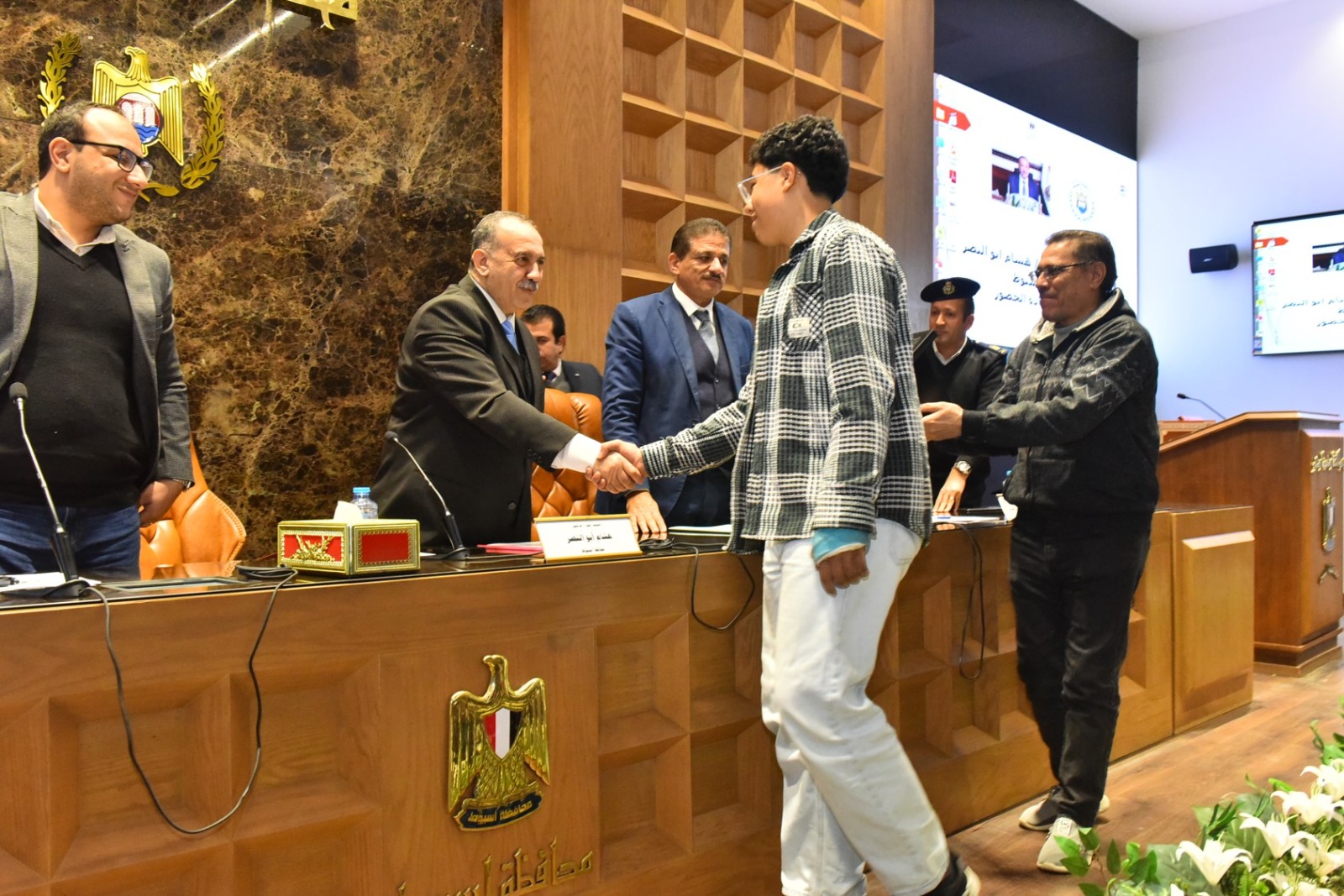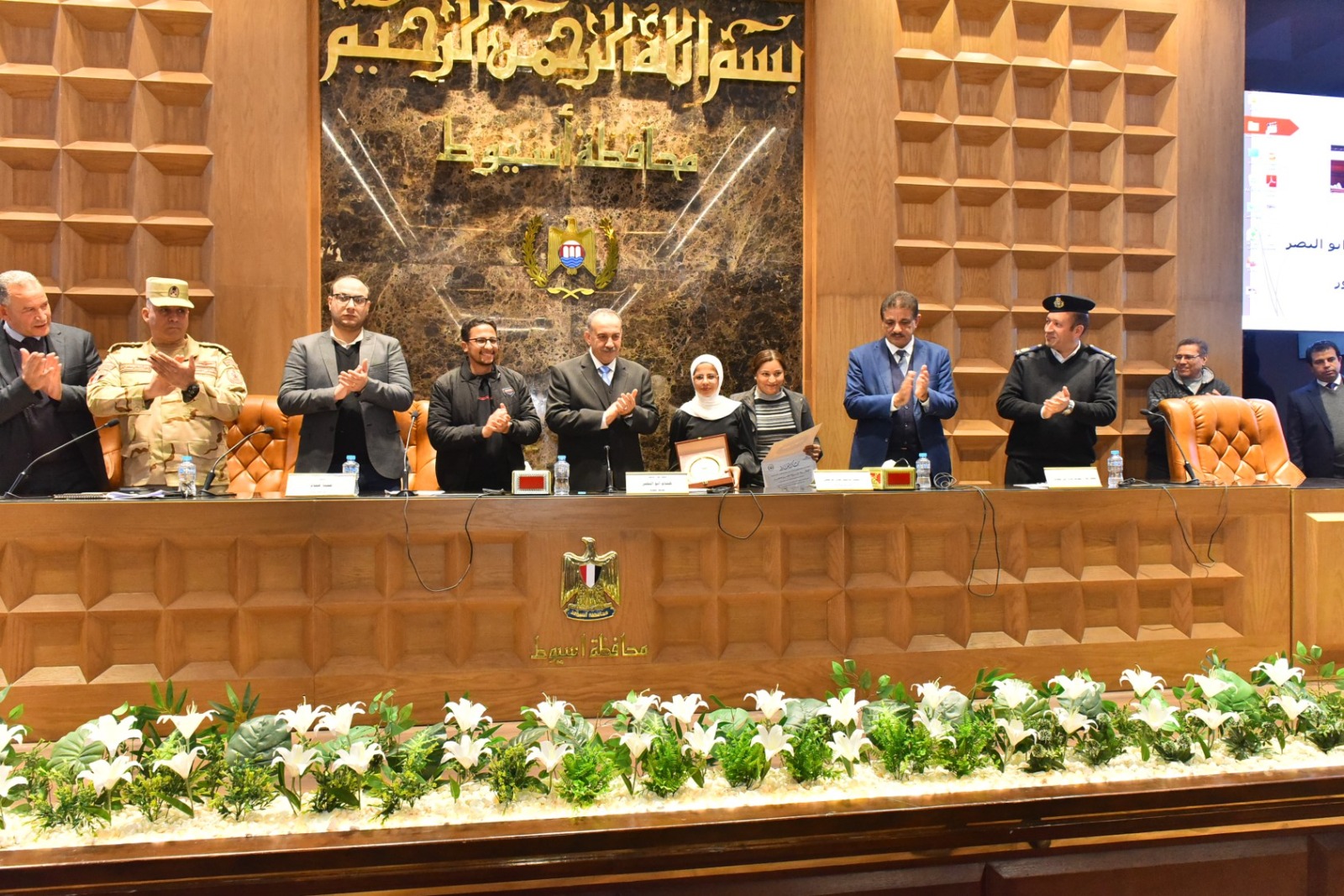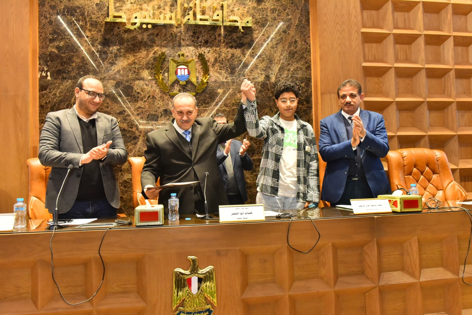 كرم اللواء دكتور هشام أبو النصر محافظ أسيوط اثنين من أبناء المحافظة من الطلاب المتميزين، تقديرًا لتفوقهما وحصولهما على مراكز متقدمة في مسابقات وطنية ودولية بمجالات الابتكار وتكنولوجيا المعلومات، وذلك خلال انعقاد جلسة المجلس التنفيذي للمحافظة بحضور الدكتور مينا عماد نائب المحافظ، والمحاسب عدلي أبو عقيل السكرتير العام، واللواء إسماعيل حسين مستشار المحافظ لشئون المكتب الفني، واللواء محمد عصامي مساعد مدير الأمن، والعميد أركان حرب هاني محمد الفاروق المستشار العسكري للمحافظة إلى جانب أعضاء المجلس التنفيذي من وكلاء الوزارات، ورؤساء المراكز والمدن والأحياء، ومديري المديريات الخدمية، ولفيف من القيادات التنفيذية.