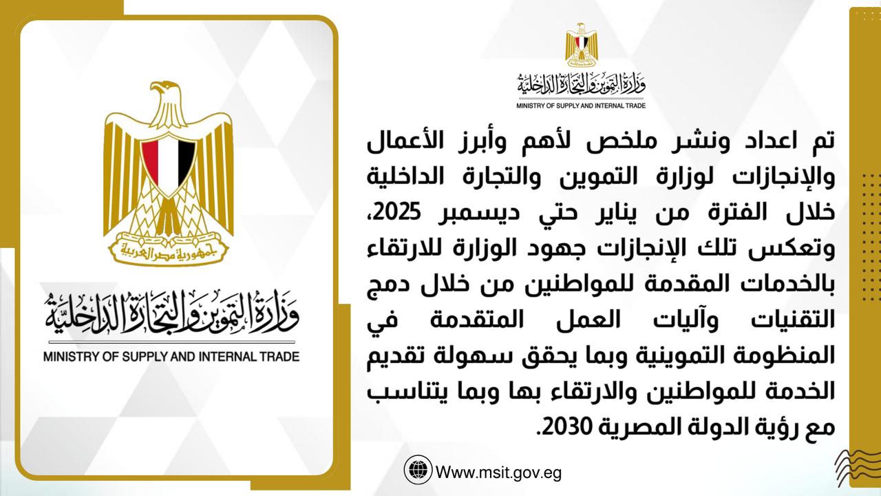 تم اعداد ونشر ملخص لأهم وأبرز الأعمال والإنجازات لوزارة التموين والتجارة الداخلية خلال الفترة من يناير حتي ديسمبر 2025، وتعكس تلك الإنجازات جهود الوزارة للارتقاء بالخدمات المقدمة للمواطنين من خلال دمج التقنيات وآليات العمل المتقدمة في المنظومة التموينية وبما يحقق سهولة تقديم الخدمة للمواطنين والارتقاء بها وبما يتناسب مع رؤية الدولة المصرية 2030.