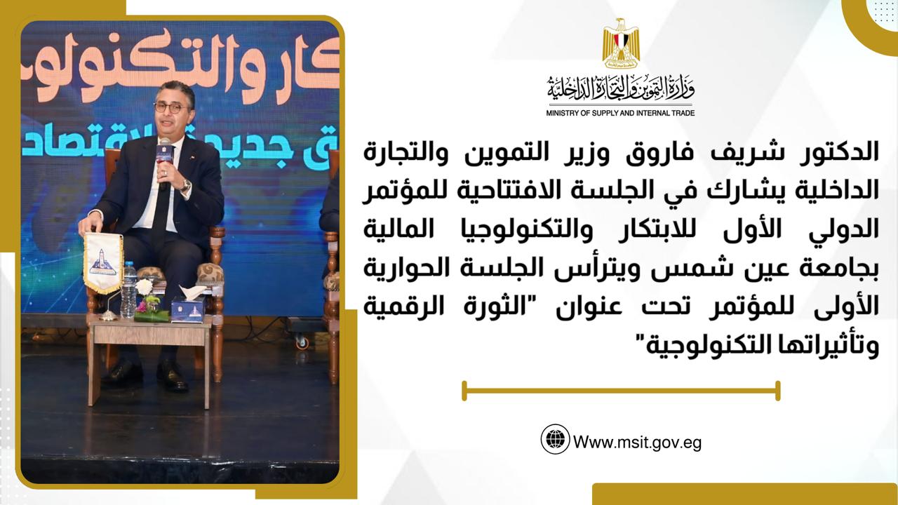 شارك الدكتور شريف فاروق، وزير التموين والتجارة الداخلية، في فعاليات المؤتمر الدولي الأول للابتكار والتكنولوجيا المالية، الذي نظمته كلية التجارة بـ جامعة عين شمس، كما ترأس الجلسة الحوارية الأولى للمؤتمر تحت عنوان «الثورة الرقمية وتأثيراتها التكنولوجية».